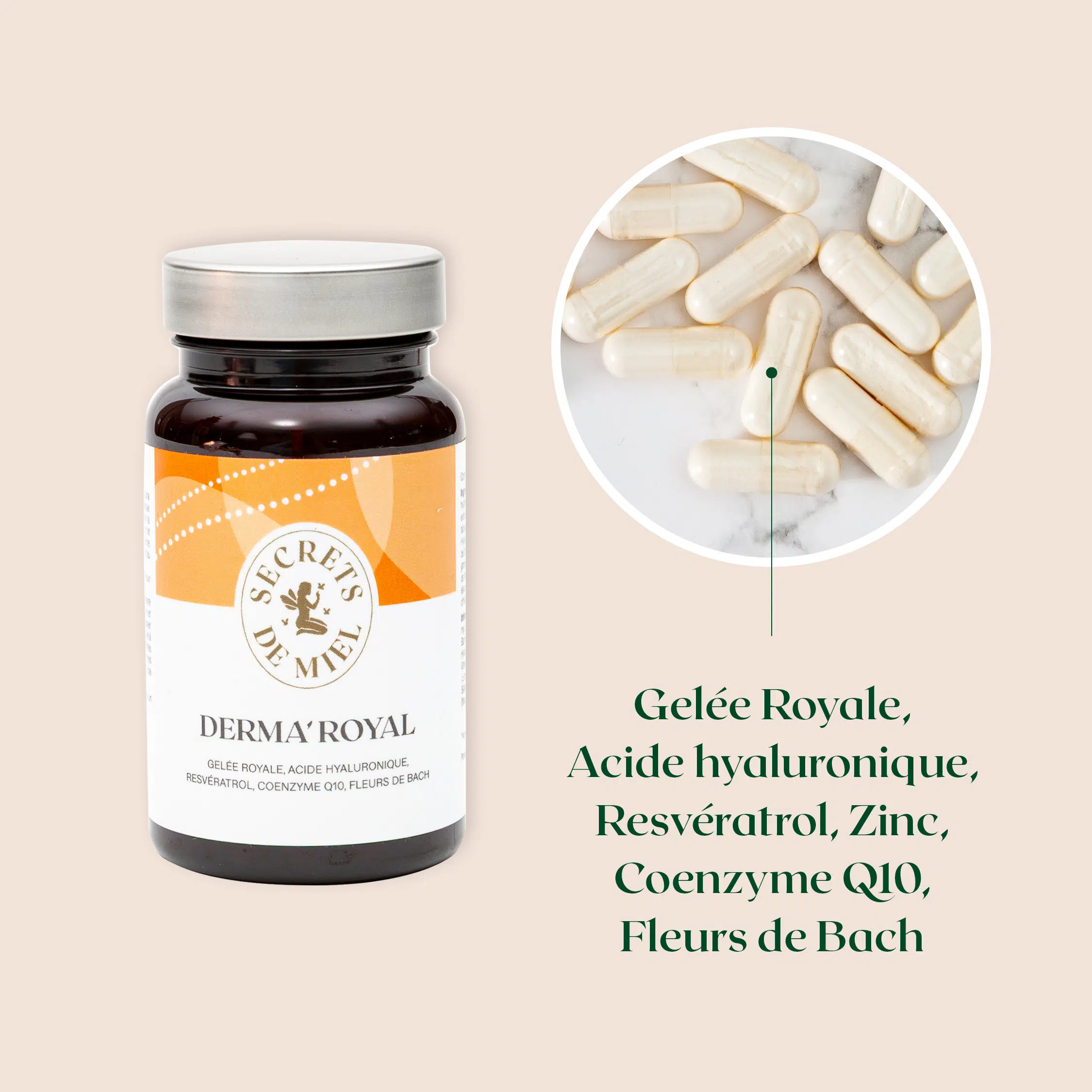 Derma’Royal est un complément alimentaire à base de Gelée Royale, d’Acide hyaluronique, de Resvératrol et de Coenzyme Q10 qui agit pour préserver la jeunesse et la beauté de votre peau.