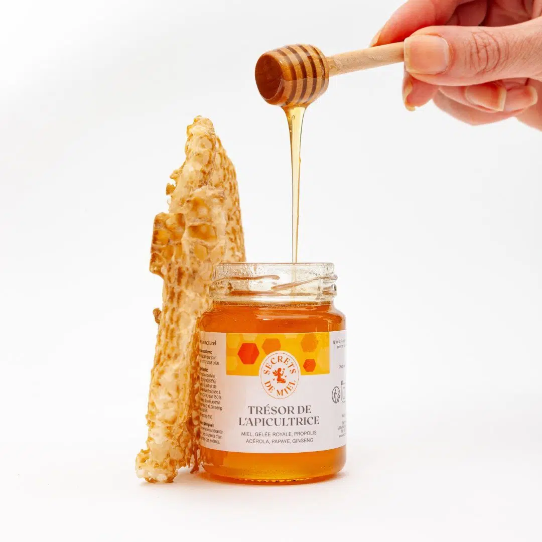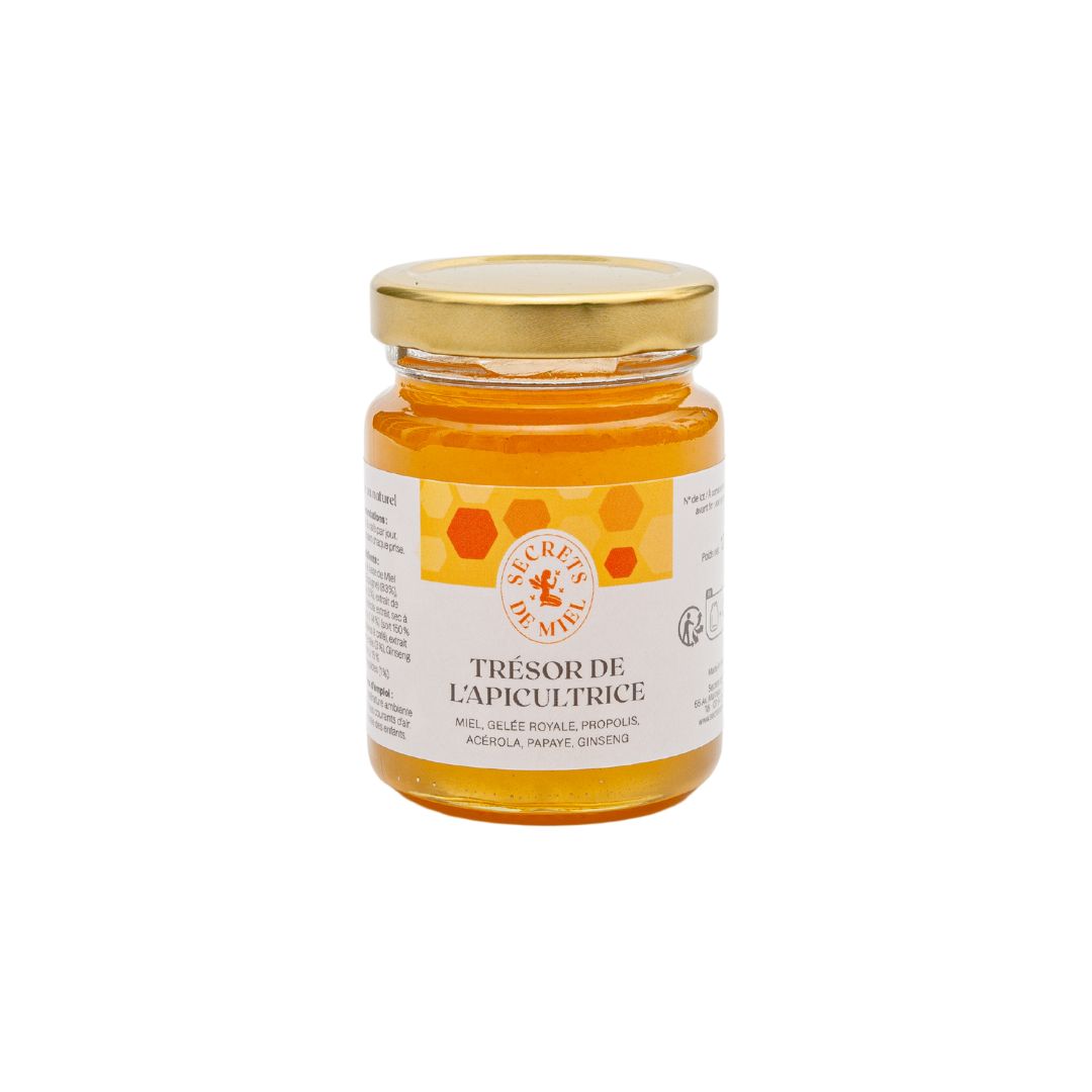 Véritable cocktail de vitalité pour toute la famille, le Trésor de l’Apicultrice est composé de Miel, de Gelée Royale, d’Extrait de Propolis, de Papaye, d’Acérola et de Ginseng, surnommé « la Racine de vie ». L’acérola est riche en vitamine C qui soutient le fonctionnement normal du système immunitaire.
