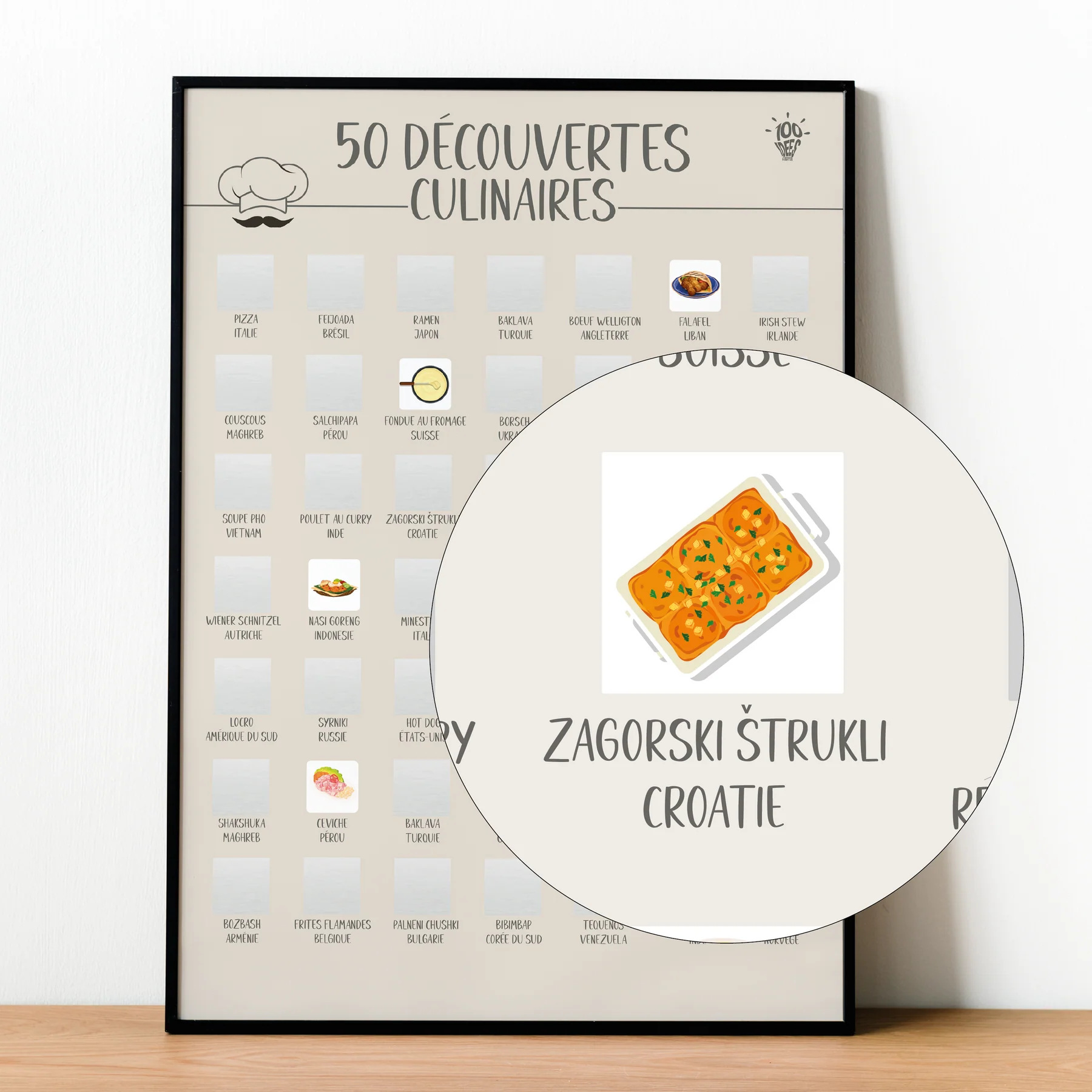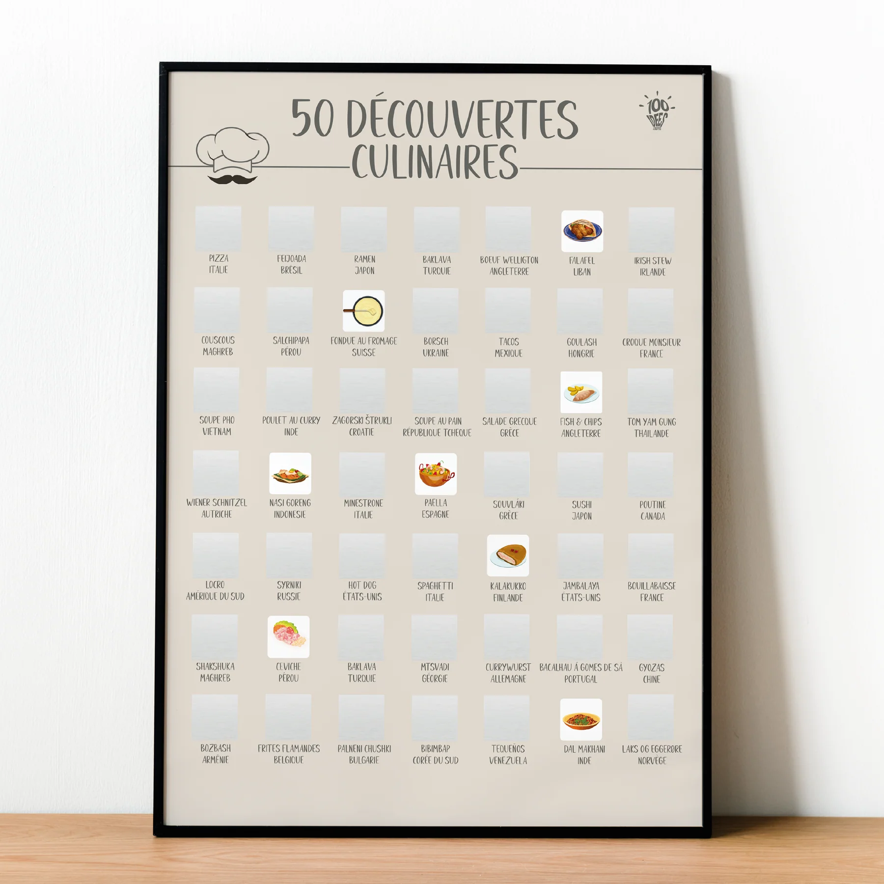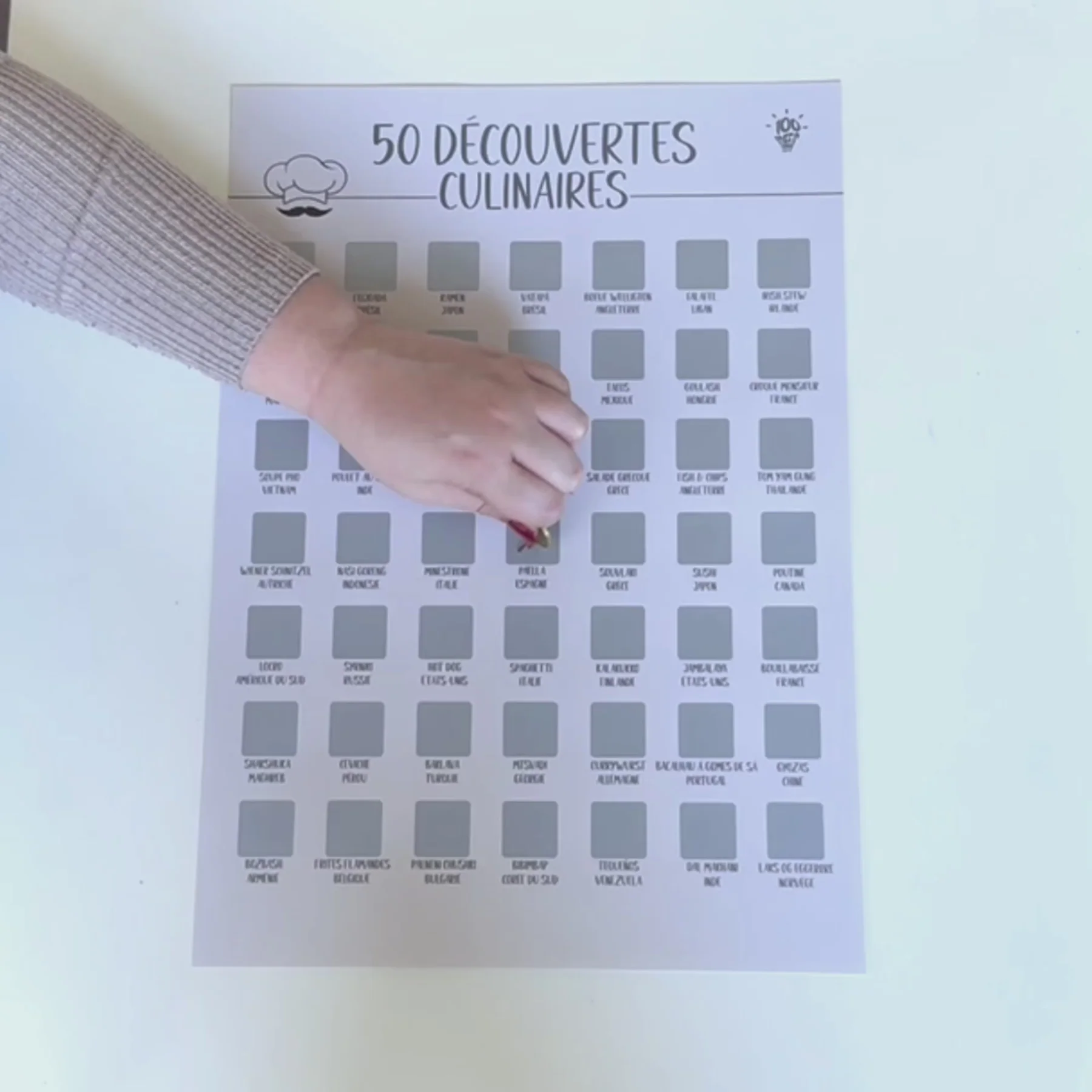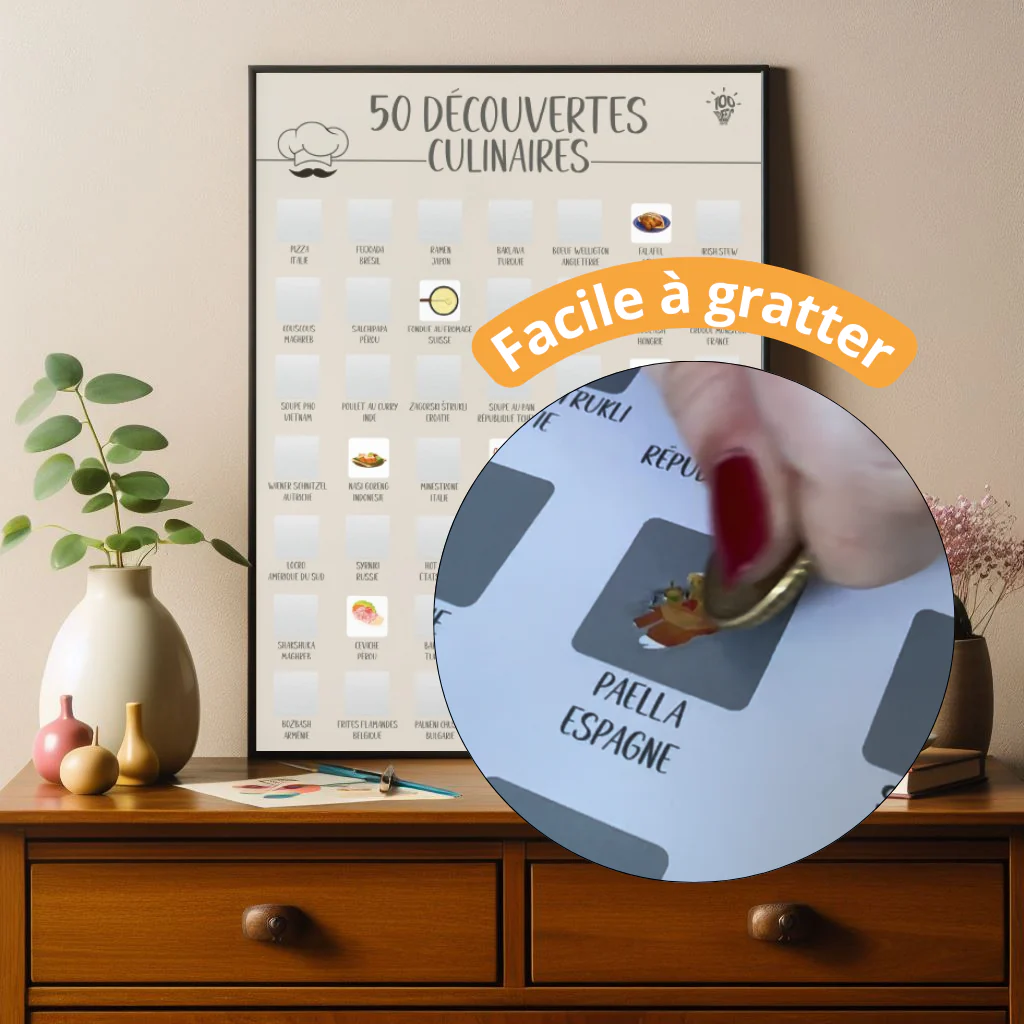 Plongez dans un univers de délices gastronomiques avec notre affiche à gratter « 50 découvertes culinaires ». Conçue pour les amateurs de cuisine, cette affiche vous invite à explorer une multitude de recettes, allant des classiques locaux aux trésors de la gastronomie mondiale. Chaque fois que vous réalisez une recette, grattez une case et créez des souvenirs gourmands inoubliables. Format A3 (29,7 x 42 cm) Fabriqué en France