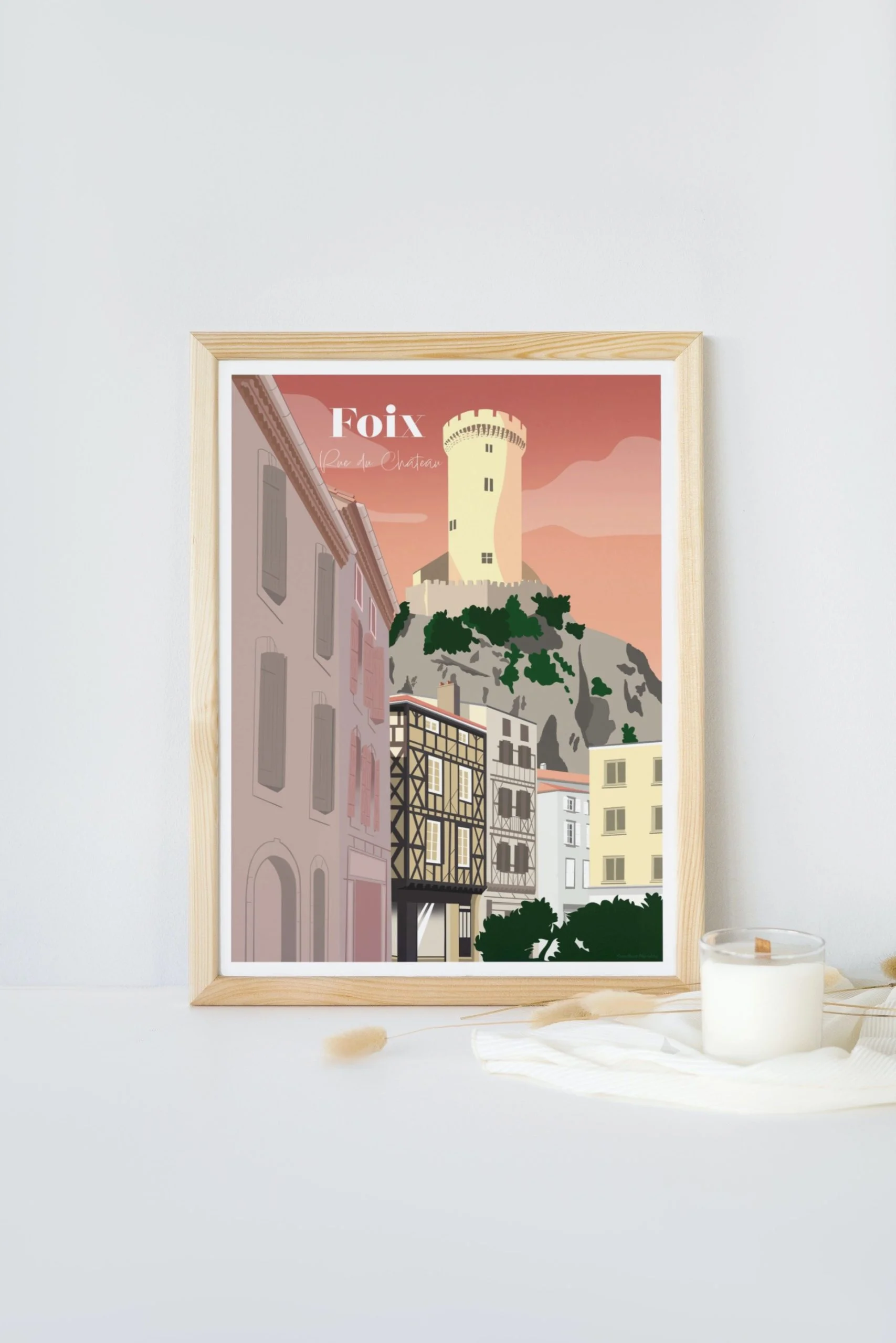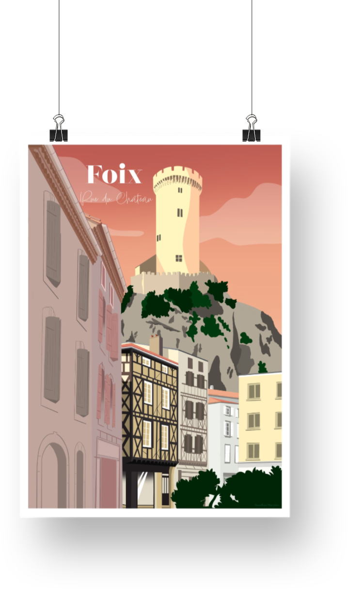 Affiche au format A3 Découvrez la ville de Foix, ses petites ruelles, ses maisons à colombages dans le centre historique, et bien sûr son emblème, le château qui domine la ville au milieu de nos belles montagnes. Fabrication 100% locale à Foix