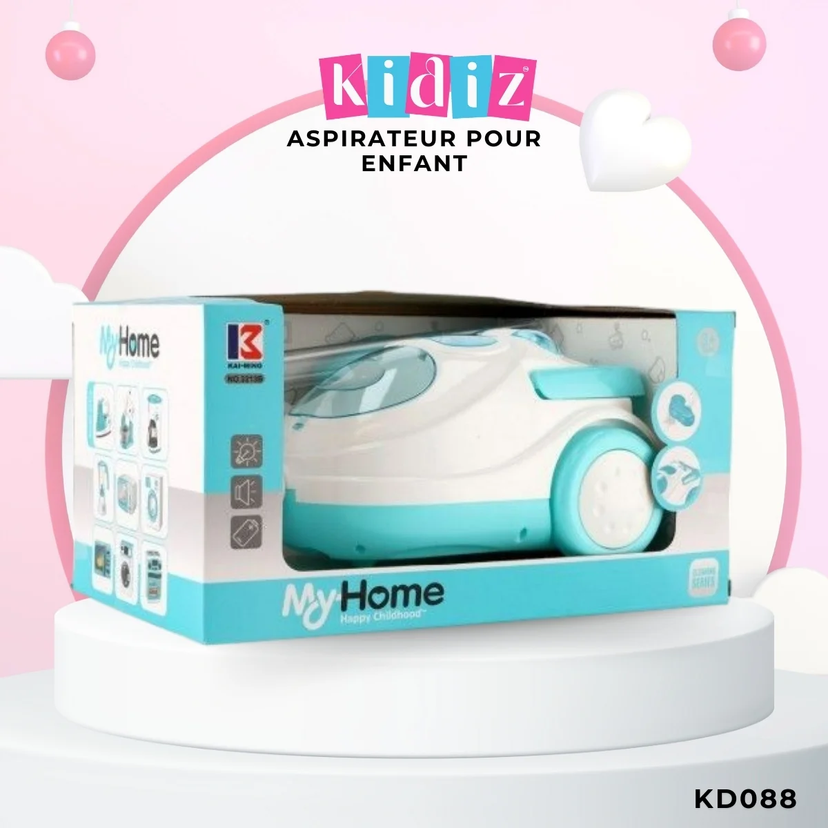 Ce jouet, fabriqué en plastique de haute qualité, se distingue par ses couleurs blanche et turquoise. Il ressemble ainsi à un véritable appareil électroménager. De plus, le tuyau renforce son réalisme, et les LED signalent son fonctionnement. Enfin, la poignée de transport permet à l’enfant de se déplacer facilement d’une pièce à l’autre.