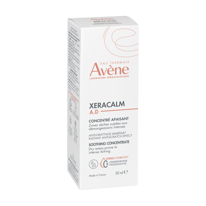 XERACALM A.D Concentré apaisant soulage immédiatement les zones sèches sujettes aux démangeaisons intenses et à l’eczéma atopique. C’est le soin SOS pour une action anti-grattage immédiate grâce à sa formule associant I-modulia®, le 1er actif postbiotique issu de l’eau thermale d’Avène qui diminue les démangeaisons, stimule les défenses de la peau et lutte contre les irritations à un complexe protecteur et réparateur ultra concentré qui réduit les pics de sécheresse sévères pour rétablir le confort cutané et à l’eau thermale d’Avène naturellement apaisante, adoucissante et anti-irritante. Idéal pour les zones récurrentes de grattage comme le visage, le corps et les paupières. Grâce à la Cosmétique Stérile®, une technologie unique permettant de maintenir stérile le produit tout au long de son utilisation et un packaging protecteur exclusif parfaitement hermétique, ce soin SOS garantit une sécurité et un respect optimal de la peau et du microbiome cutané. Sans conservateurs, sans parfum, non comédogène, formulé avec un minimum d’ingrédients et élaboré en vue de minimiser les risques de réactions allergiques, XERACALM A.D Concentré apaisant est idéal pour la peau des nourrissons, des enfants et des adultes .