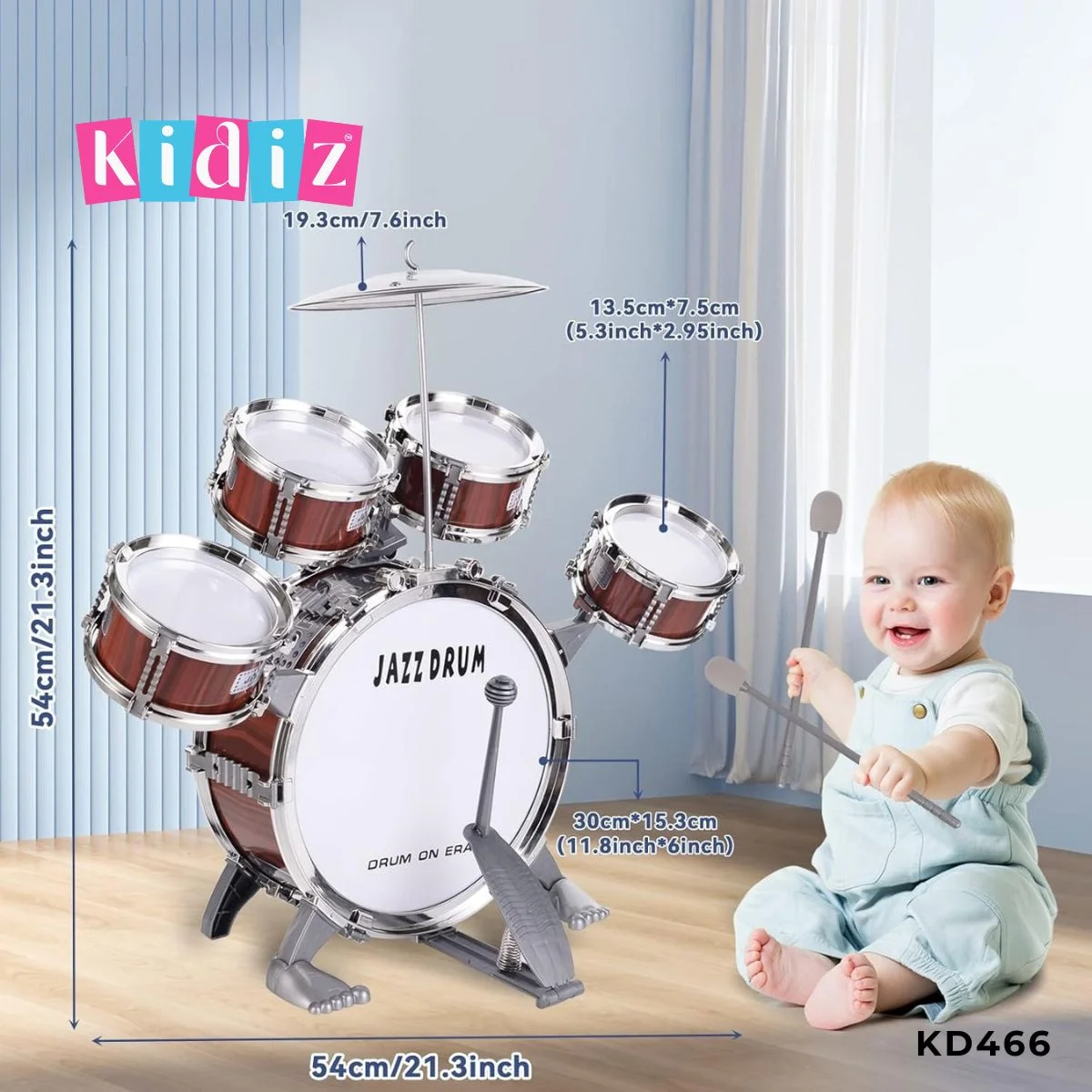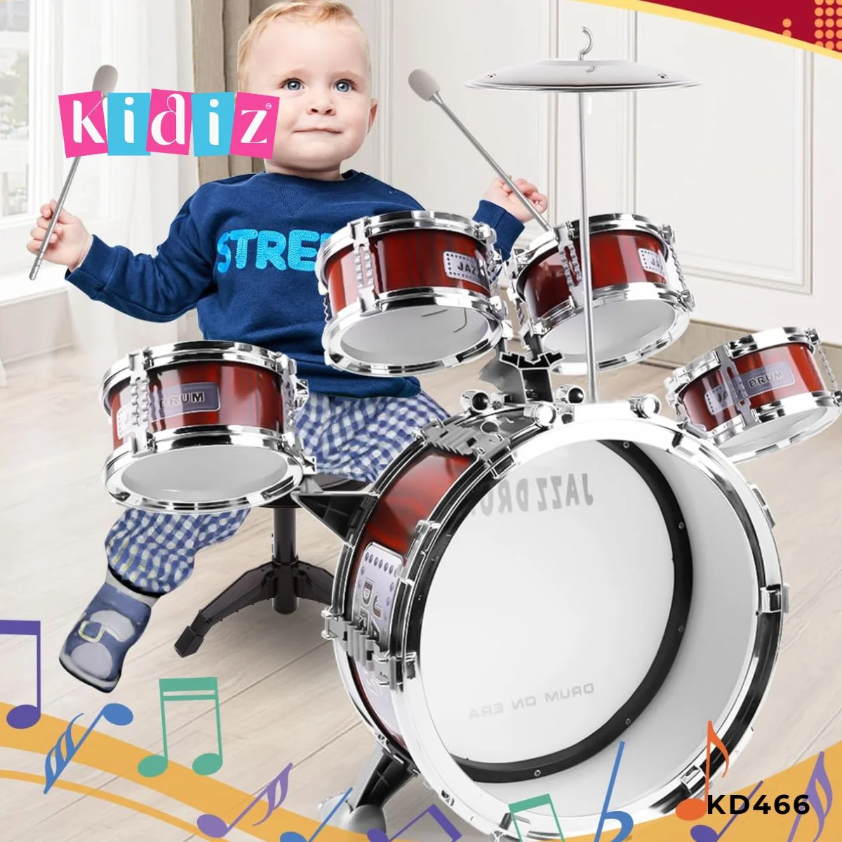 Initiez votre enfant au rythme ! Un ensemble de batterie jazz complet avec 5 tambours, cymbale, pédale et tabouret pour des concerts inoubliables dès 3 ans.