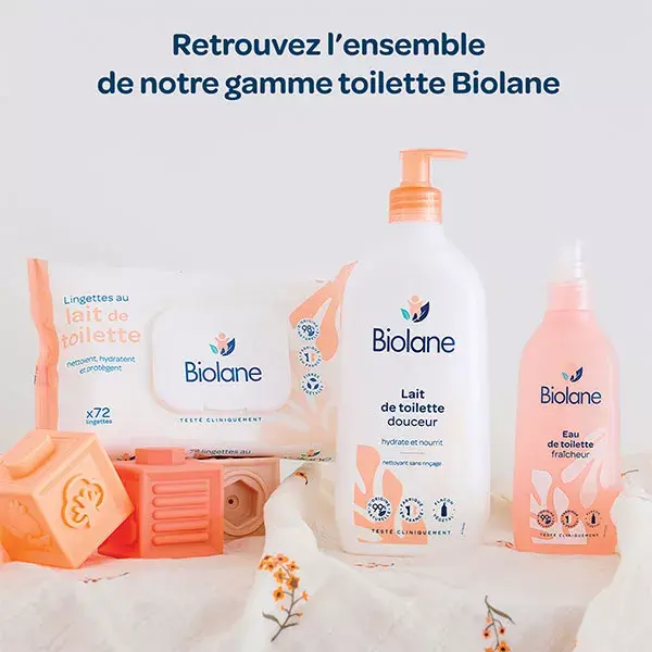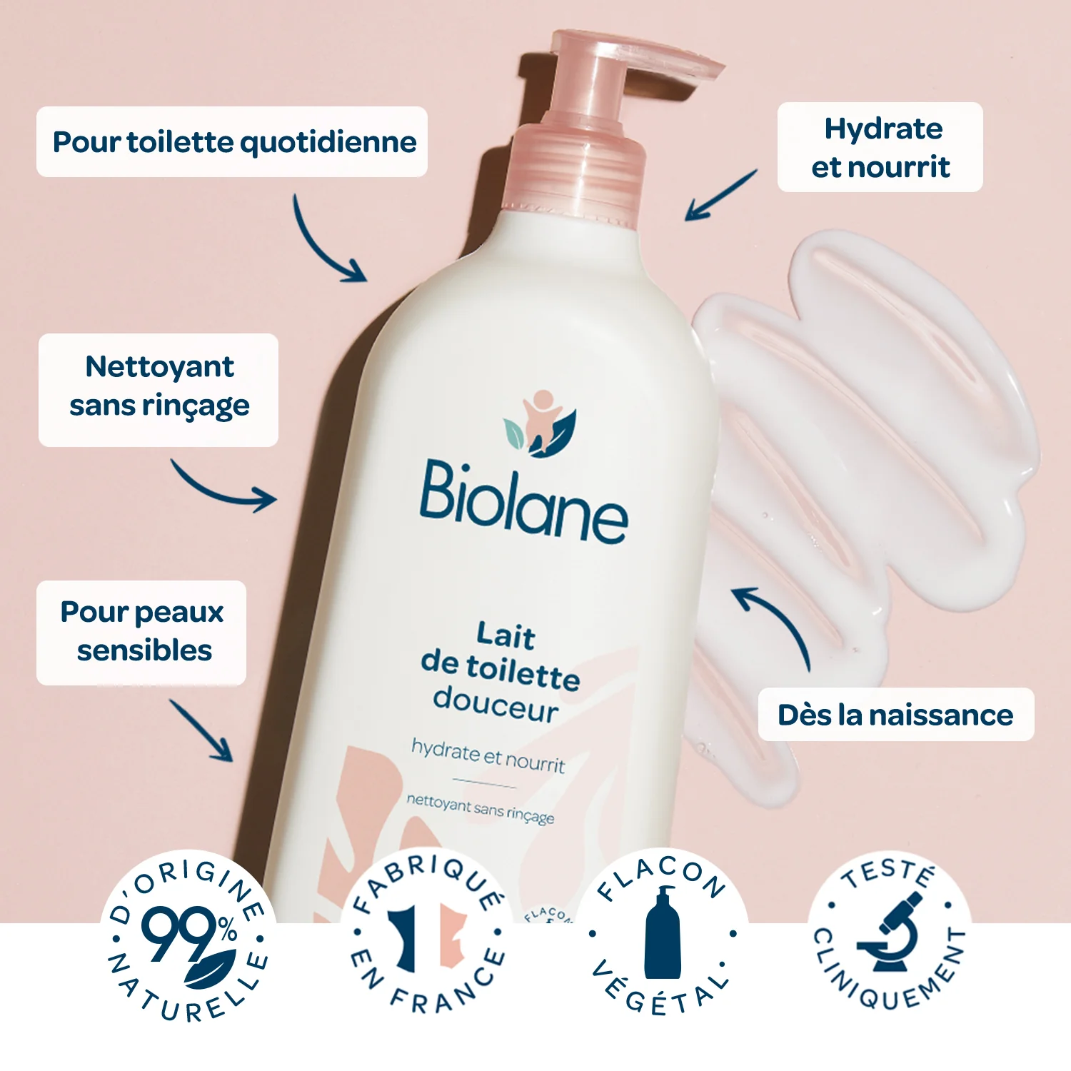 LAIT DE TOILETTE : Le lait de toilette bebe Biolane, permet de nettoyer le visage, le corps et le siège de bébé en douceur. Ce lait nettoyant bebe s’applique tous les jours pour la toilette à l’aide d’un coton, le lait de toilette bebe convient aussi comme démaquillant pour maman ! PEAUX SENSIBLES : Afin de préserver l’équilibre cutané naturel, le lait de toilette bebe Biolane a été formulée à pH physiologique – sa base lavante douce garantit un nettoyage en délicatesse. Ce lait nettoyant bebe protège la peau sensible de votre bébé. Légèrement parfumé, le lait nettoyant bebe laisse…