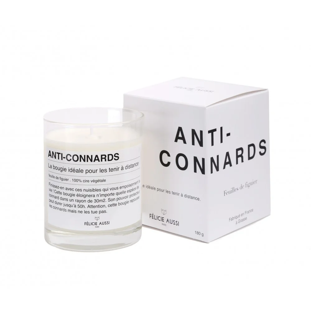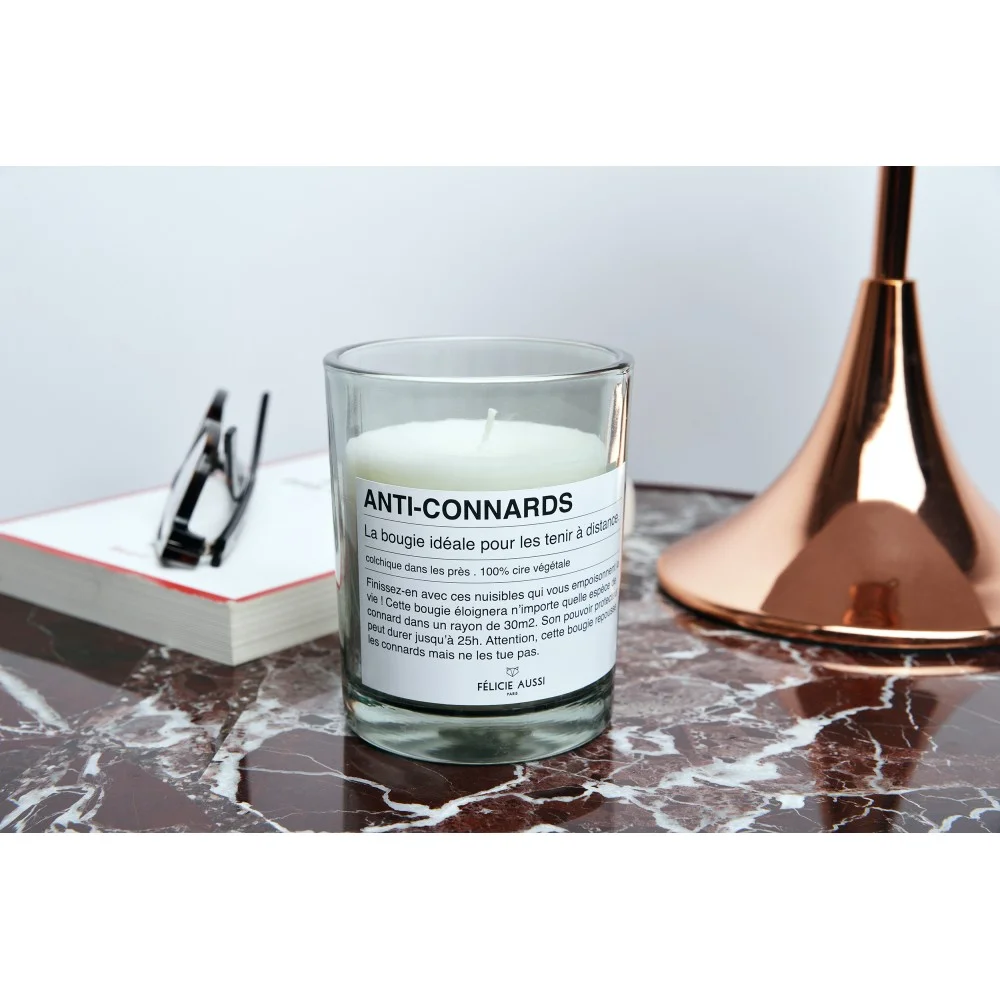 « Finissez-en avec ces nuisibles qui vous empoisonnent la vie ! Cette bougie éloignera n’importe quelle espèce de connard dans une surface de 30m². Son pouvoir protecteur peut durer jusqu’à 50h. Attention, cette bougie repousse les connards mais ne les tue pas. »