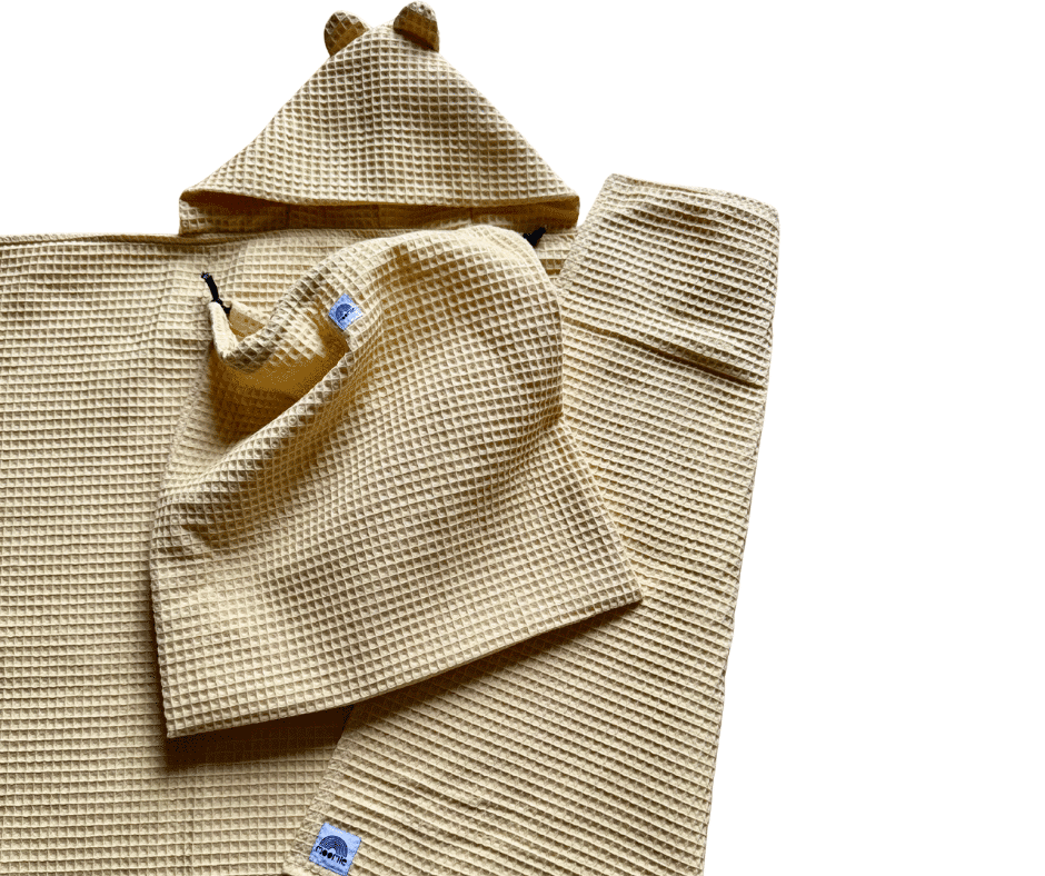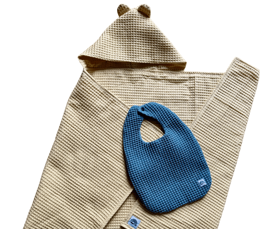 Une grande cape de bain en nid d’abeille (100 % coton).