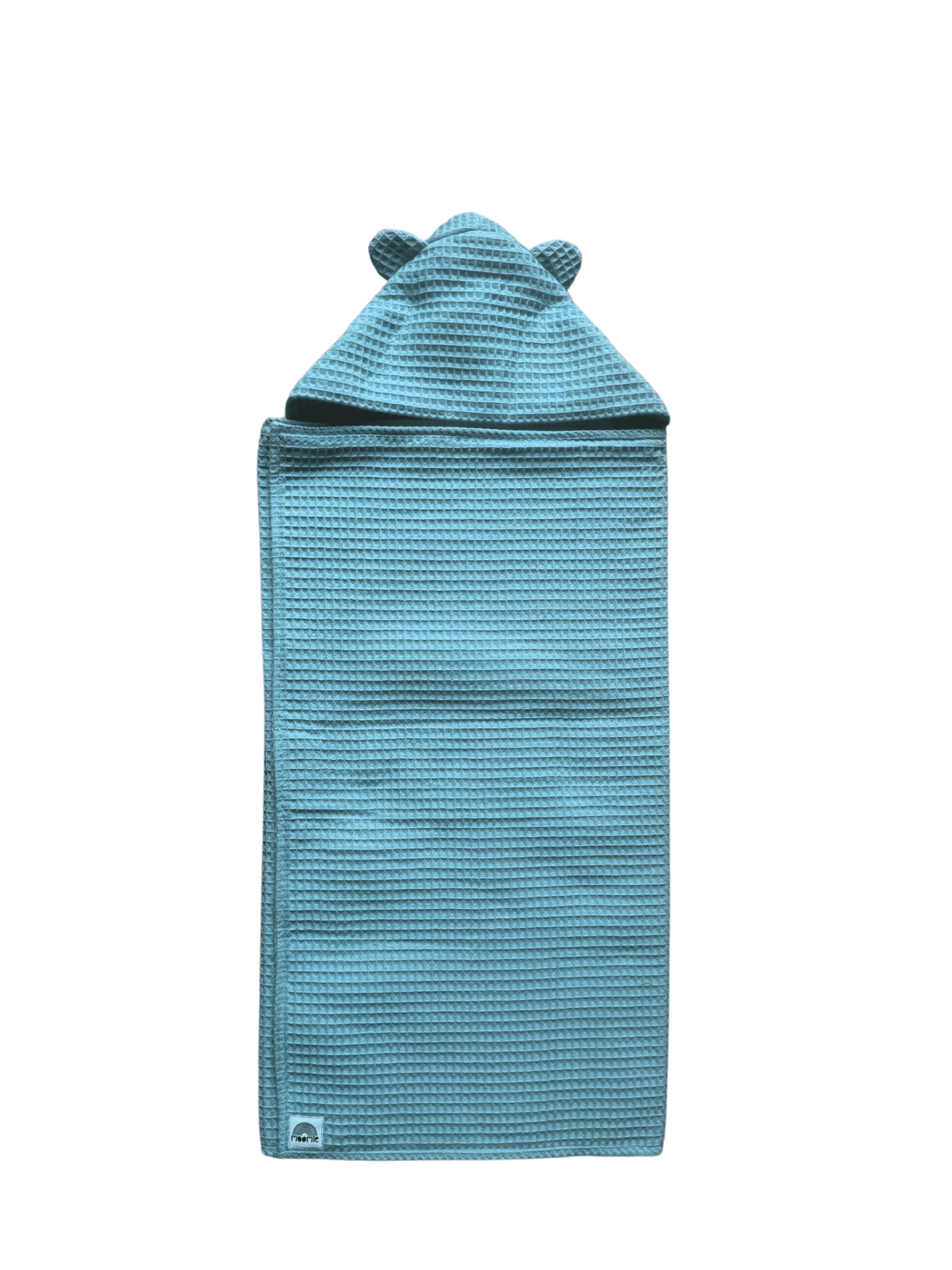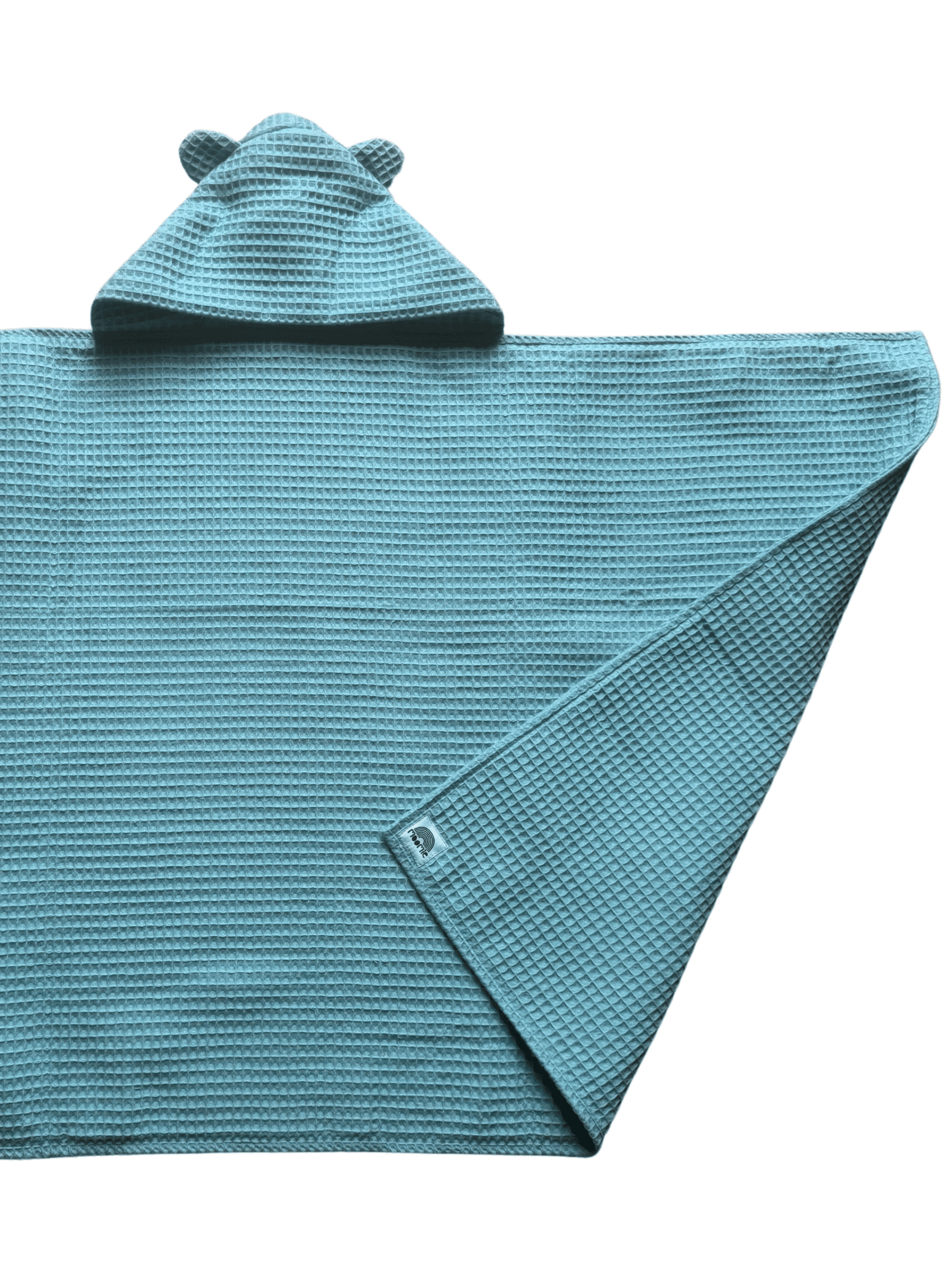 Une grande cape de bain en nid d’abeille (100 % coton).
