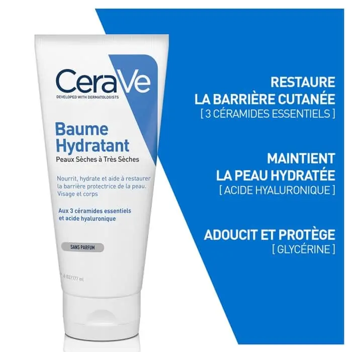 Le Baume Hydratant de CeraVe est un soin qui hydrate les peaux sèches à très sèches. Ce baume hydratant et réparateur s’applique sur le visage et le corps pour une peau douce et hydratée. Sa texture est non grasse et ne colle pas à la peau pour un habillage rapide. Enrichi aux  3 céramides essentiels et à l’ acide hyaluronique, il nourrit et hydrate en continu pendant 48 heures*. Il restaure la barrière cutanée grâce à la technologie MVE, qui encapsule les actifs et les diffuse tout au long de la journée. En effet, une barrière cutanée altérée peut être à l’origine d’affections…