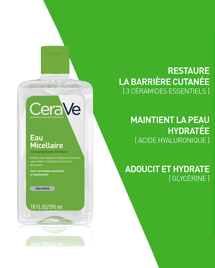 L’Eau Micellaire de CeraVe est un produit 3-en-1 qui nettoie, démaquille et hydrate les peaux normales à sèches, sans altérer la barrière cutanée. Elle nettoie la peau en douceur et élimine les impuretés, la pollution et le maquillage du visage, des yeux et du cou. Enrichie aux 3 céramides essentiels, à la niacinamide et à la glycérine, elle hydrate, adoucit et apaise la peau. Développée avec des dermatologues et selon une charte de formulation stricte, cette formule est respectueuse de la peau avec un pH physiologique, sans parfum, hypoallergénique et non-comédogène. Testée sous contrôle ophtalmologique, elle convient même aux yeux les plus sensibles. Format…