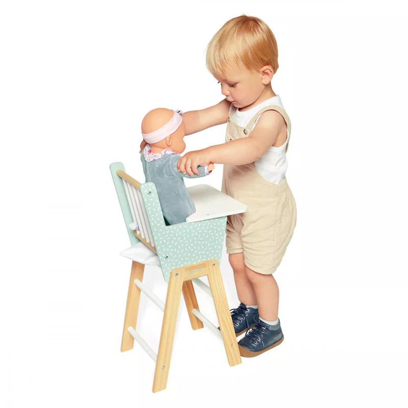 C’est l’heure du repas pour bébé ! Avec cette adorable chaise haute en bois pour poupon, les enfants dès 3 ans vont adorer donner à manger à leurs bébés. Compatible avec les poupons jusqu’à 42 cm (non fourni), la chaise haute est équipée d’un coussin pour installer confortablement son poupon favori pour le goûter. Une cuillère pour mamie, une cuillère pour doudou … Les enfants imitent papa ou maman et prennent soin de leurs poupées avec ce beau jouet d’imitation en bois. La tablette sur le devant permet d’installer la dinette et tout le nécessaire pour nourrir son poupon préféré. Toute la famille apprécie le look frais et authentique de ce mobilier pour poupons. Une chaise haute en bois issue de la gamme Zen de Janod, fabriquée en bois FSC®, c’est un accessoire incontournable pour équiper la nurserie des apprentis parents !