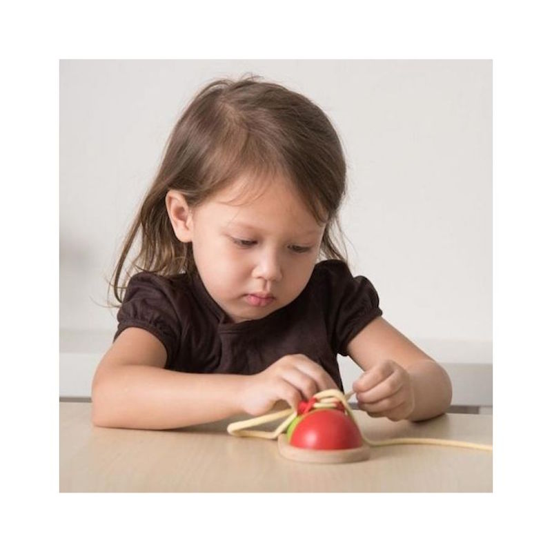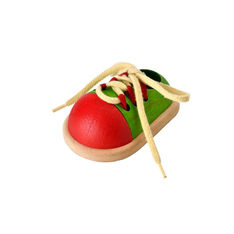 Cette adorable petite chaussure Plan Toys permet à l’enfant de s’exercer à faire et à refaire des lacets de chaussures.