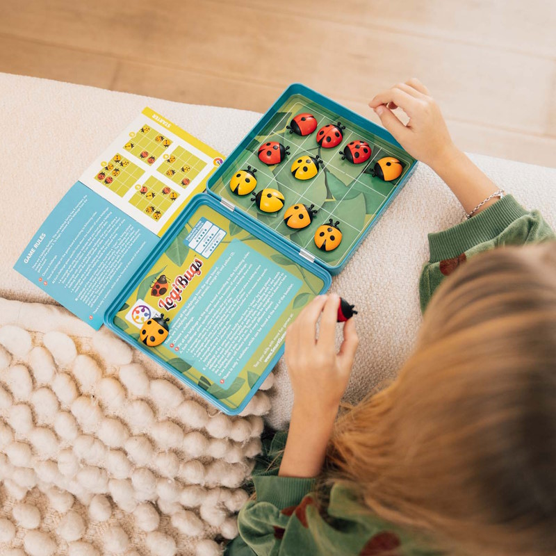 « Coccinelles Demoiselles » est un jeu magnétique de déduction dans lequel vous devrez trouver où poser vos coccinelles sur les feuilles de l’arbre. L’ordre prescrit tient compte de la couleur des trois familles et des valeurs numériques de chaque coccinelle représentées par le nombre de points sur leur dos.
