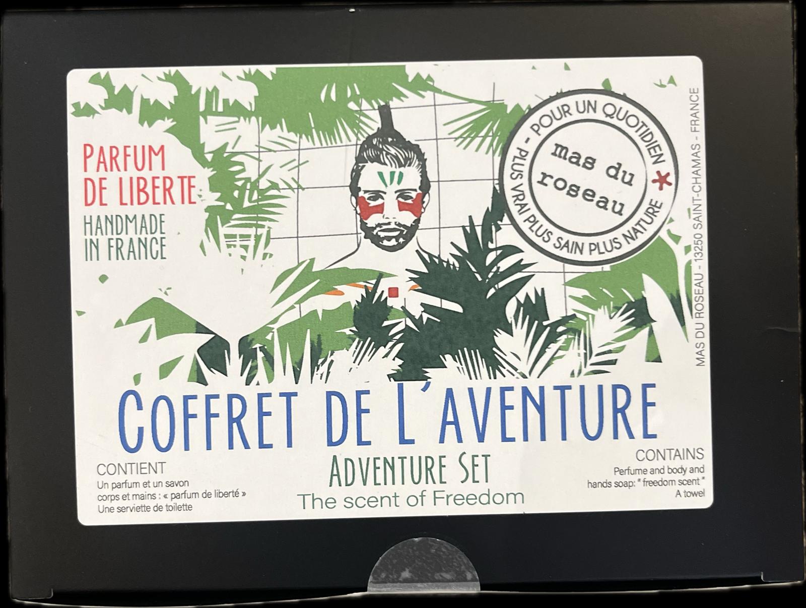 Le Coffret de l’Aventure contient trois essentiels : un savon artisanal, un « parfum de liberté » et une serviette de toilette. Le savon, doux et naturel, nettoie efficacement tout en respectant la peau. Le parfum, aux notes fraîches et boisées, évoque la liberté et la force de la nature.