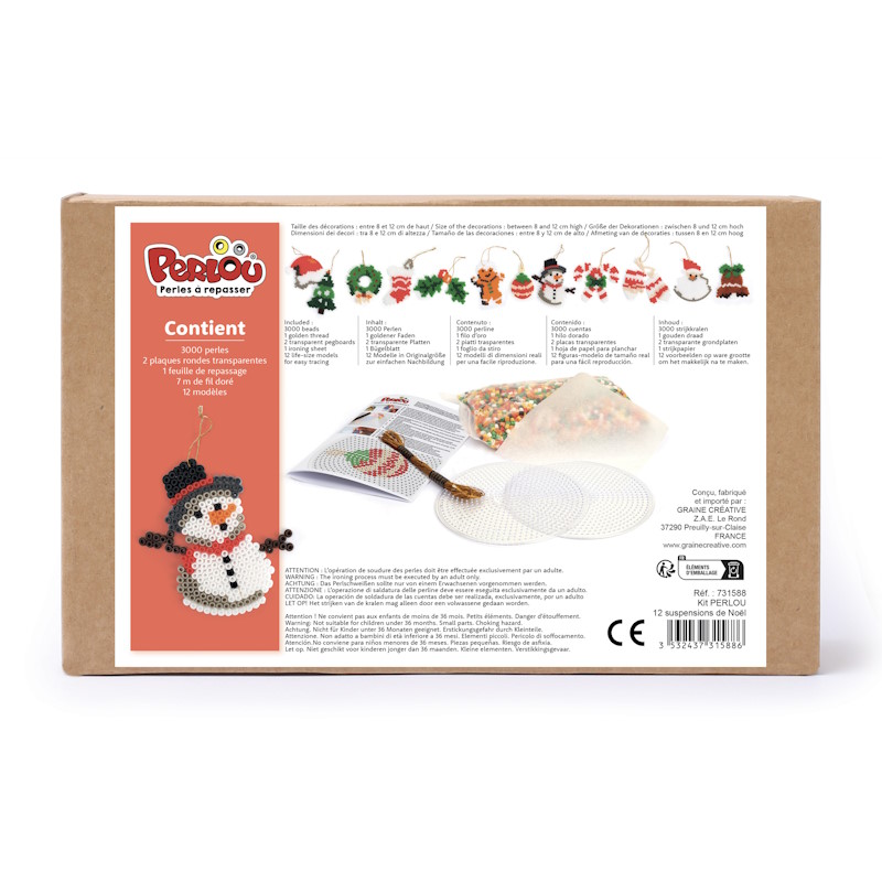 Créez 12 superbes suspensions en Perlou pour embellir votre sapin en famille avec les deux plaques et le livret de créations inclus. Accrochez-les ensuite avec le fil doré fourni.