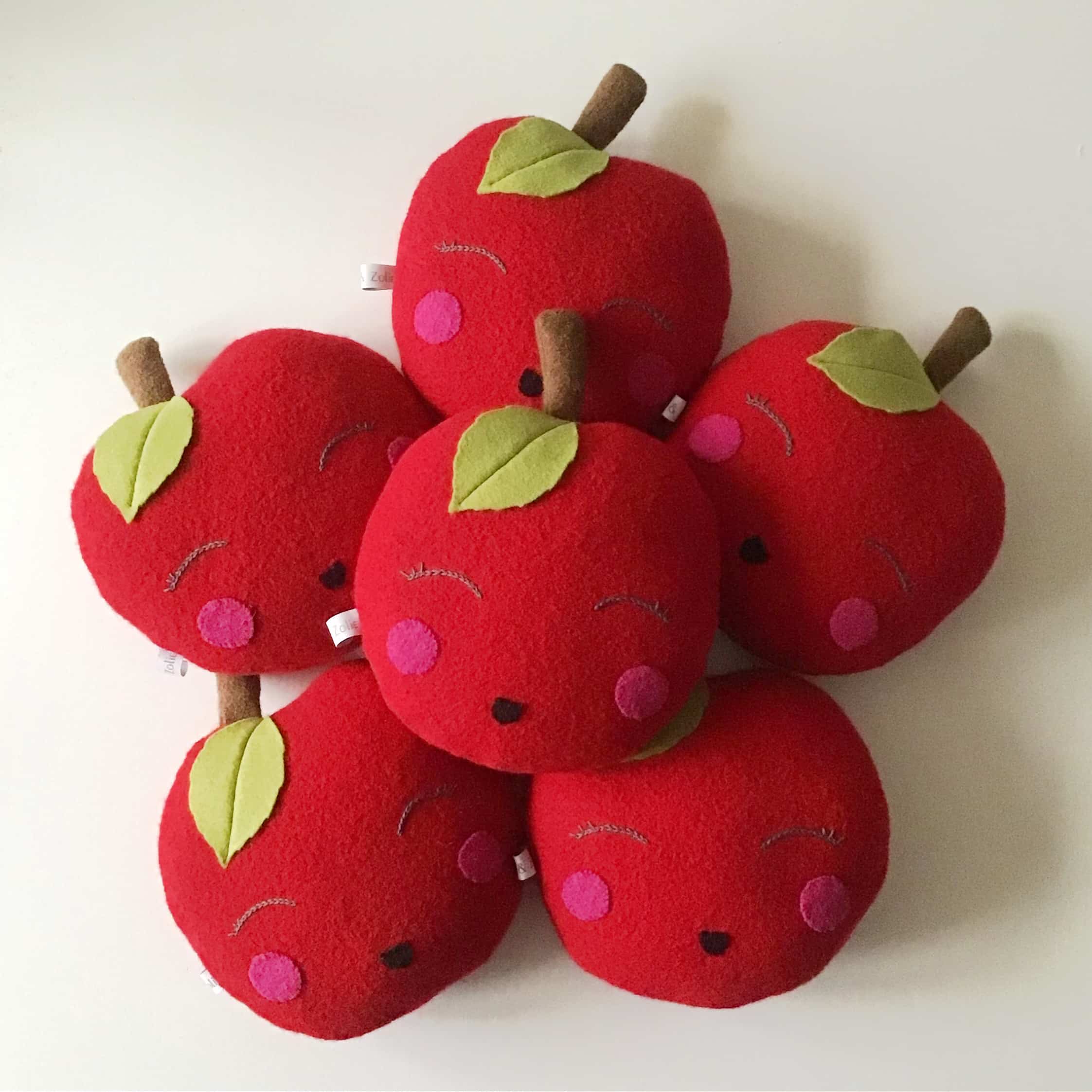 Les pommettes sont en laine rose. La feuille est en laine verte et la queue en laine marron.