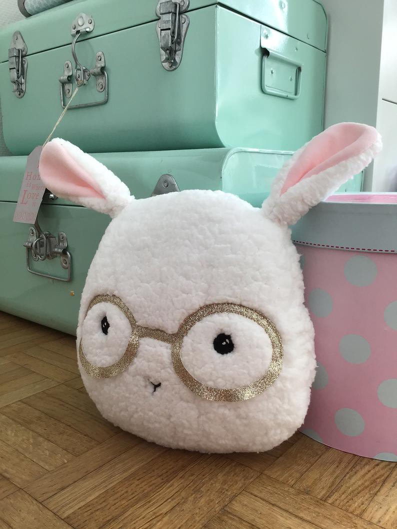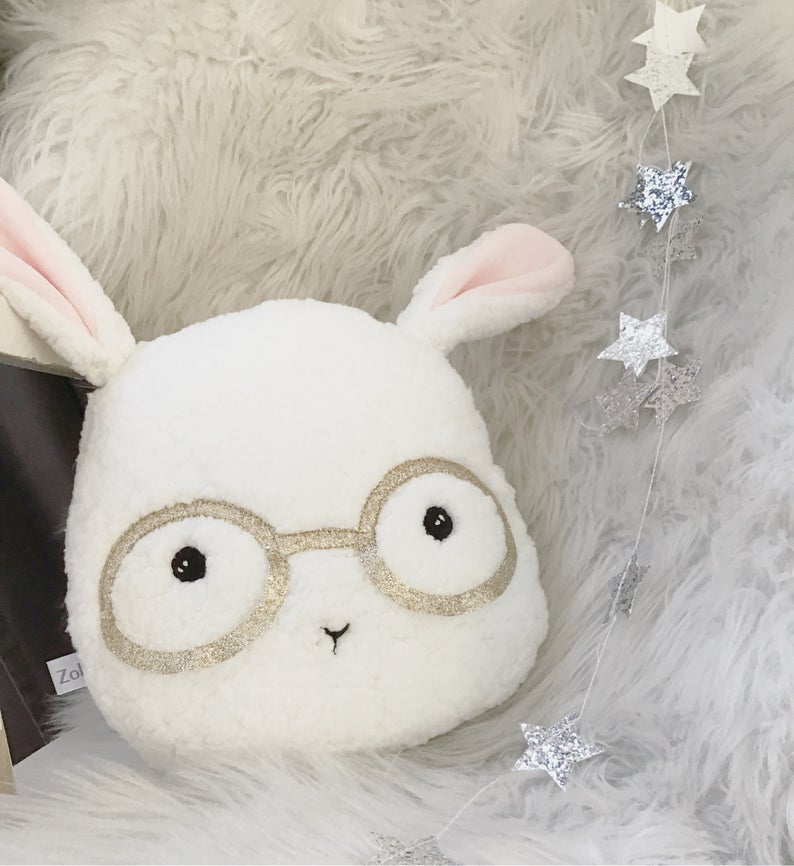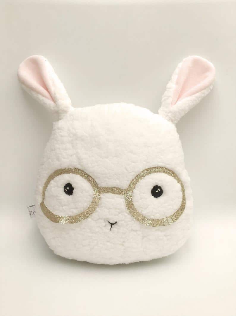 Le coussin est blanc, les yeux et le museau sont brodés à la main.