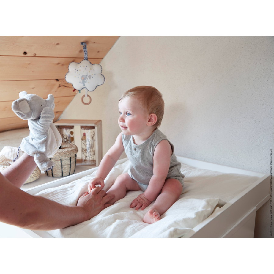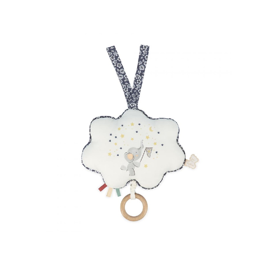 Kaloo propose cette boîte à musique en tissu doux, facile à accrocher au plus près de bébé avec ses rubans en tissu.
