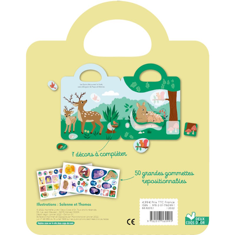 12 pages de décors à compléter avec 50 grandes gommettes pour découvrir les bébés des animaux. L’enfant est guidé sur chaque page pour pouvoir coller chaque gommette au bon endroit et dans le bon décor ! Et dans chaque scène, un texte très court lui raconte une histoire. Un graphisme doux, une activité pour développer son imaginaire, qui valorise la créativité et l’autonomie des tout-petits.