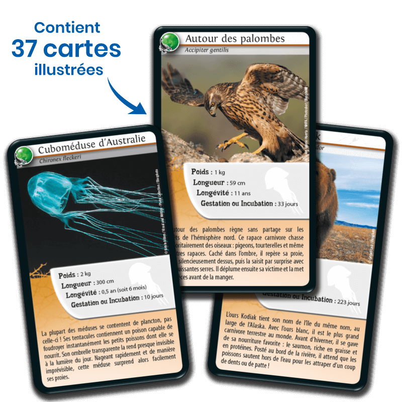Le principe de Défis Nature – Animaux Redoutables est simple : lors d’un tour de jeu, les enfants de 7 ans et + parient sur l’un des points forts de leur animal. Le joueur qui possède la plus forte caractéristique remporte les cartes des autres joueurs. Le premier à collecter toutes les cartes du jeu gagne la partie.