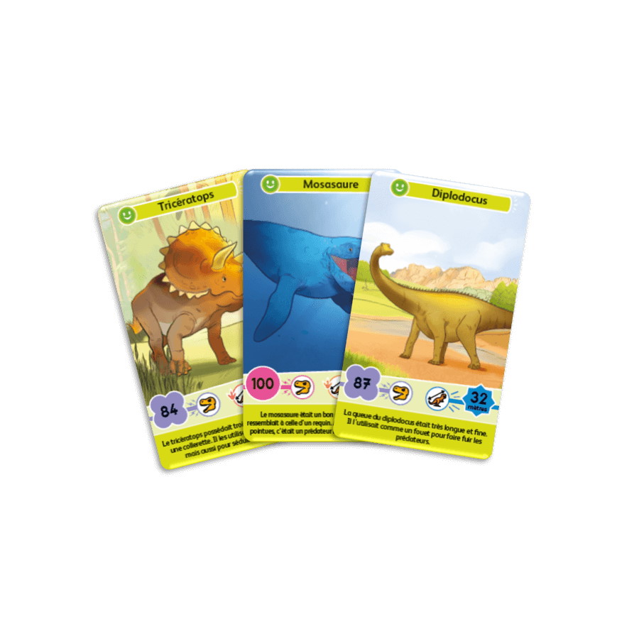 Le principe de Défis Nature Junior – Au Temps des Dinosaures est simple : les enfants, à partir de 5 ans, parient sur la vitesse ou la longévité des dinosaures. Celui qui possède la plus forte caractéristique remporte les cartes des autres joueurs. Le joueur ayant collectionné le plus de cartes à la fin de la partie, l’emporte.
