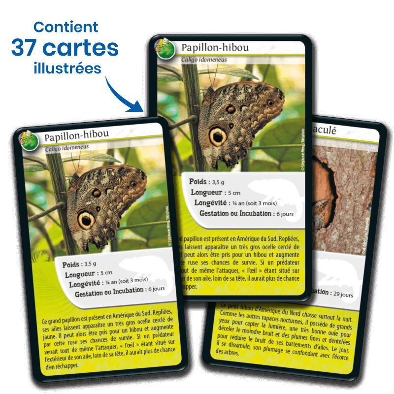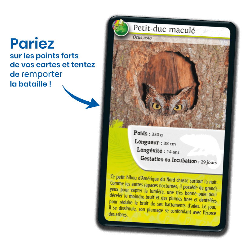 Le principe de Défis Nature – Rois du Camouflage est simple : lors d’un tour de jeu, les enfants de 7 ans et + parient sur l’un des points forts de leur animal. Le joueur qui possède la plus forte caractéristique remporte les cartes des autres joueurs. Le premier à collecter toutes les cartes du jeu gagne la partie.