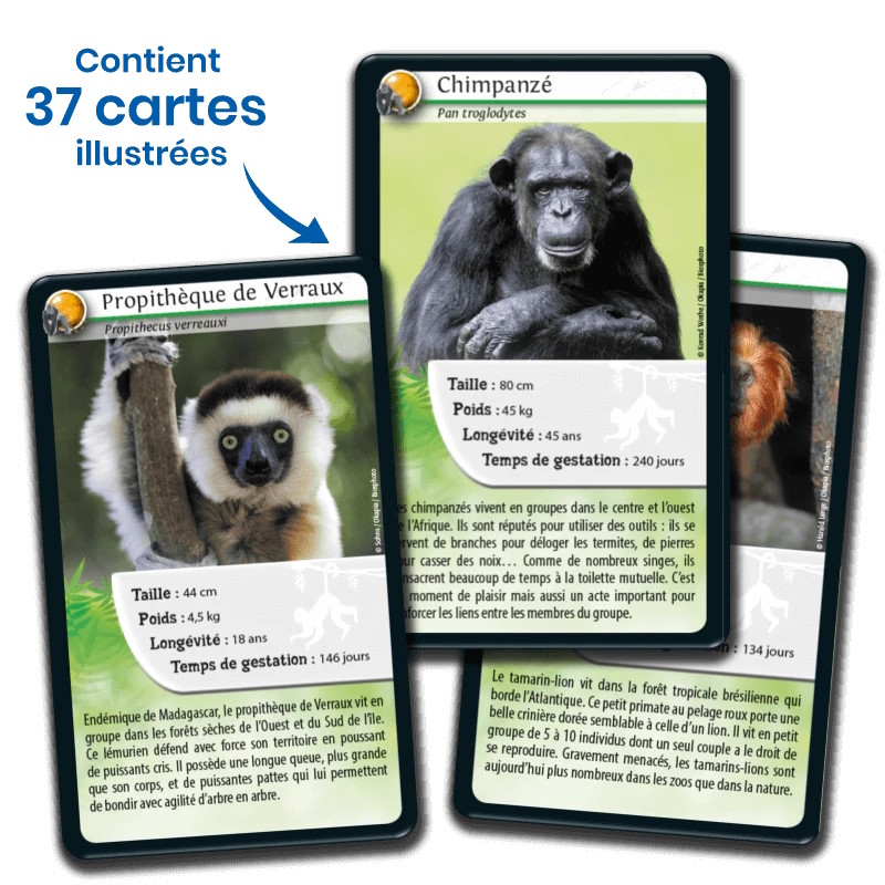Partez à la rencontre des Singes et autres Primates avec le Défis Nature – Singes et autres Primates de BIOVIVA ! Découvrez vos animaux, comparez leurs caractéristiques et remportez un maximum de cartes !