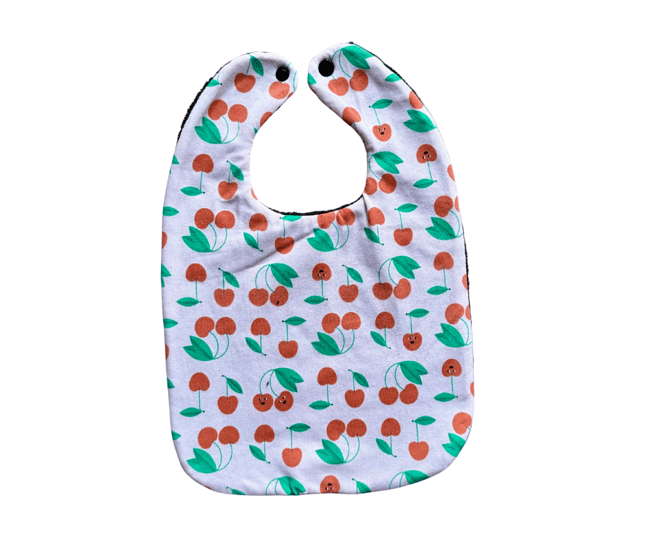 Un bavoir fabriqué en France avec un joli imprimé cerises.
