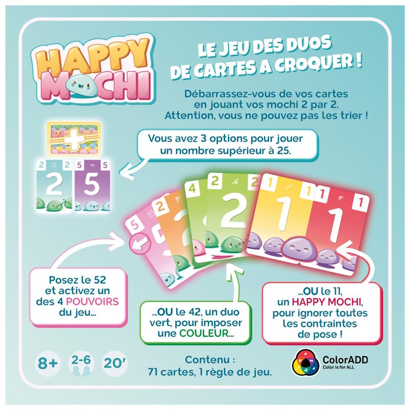 Pour ce faire, prenez deux cartes ADJACENTES dans votre main pour recouvrir le duo central, en respectant les contraintes de valeur (inférieure ou supérieure) et de couleur. Si vous jouez deux cartes de même valeur, c’est un Happy Mochi, ne tenez pas compte des contraintes ! Une fois un duo joué, appliquez ses effets éventuels : tourner la carte Sens, faire piocher, passer une carte à son voisin, ou mettre une carte en réserve.