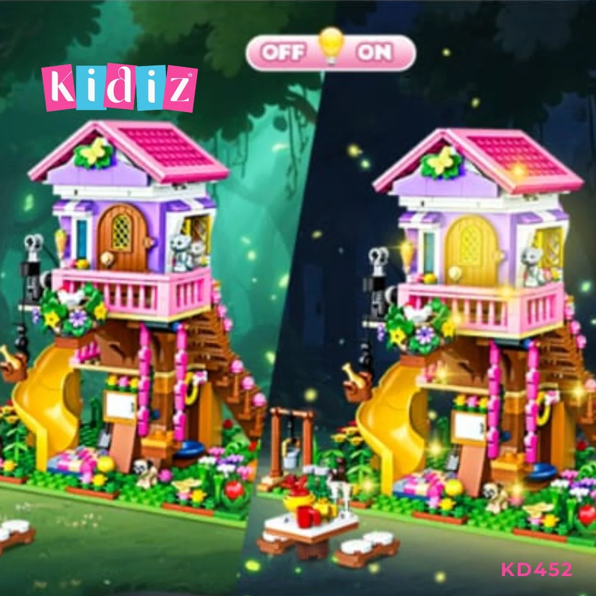 Éclairage Intégré : Le jouet dispose d’un mode « ON/OFF » pour illuminer la cabane avec des lumières scintillantes.