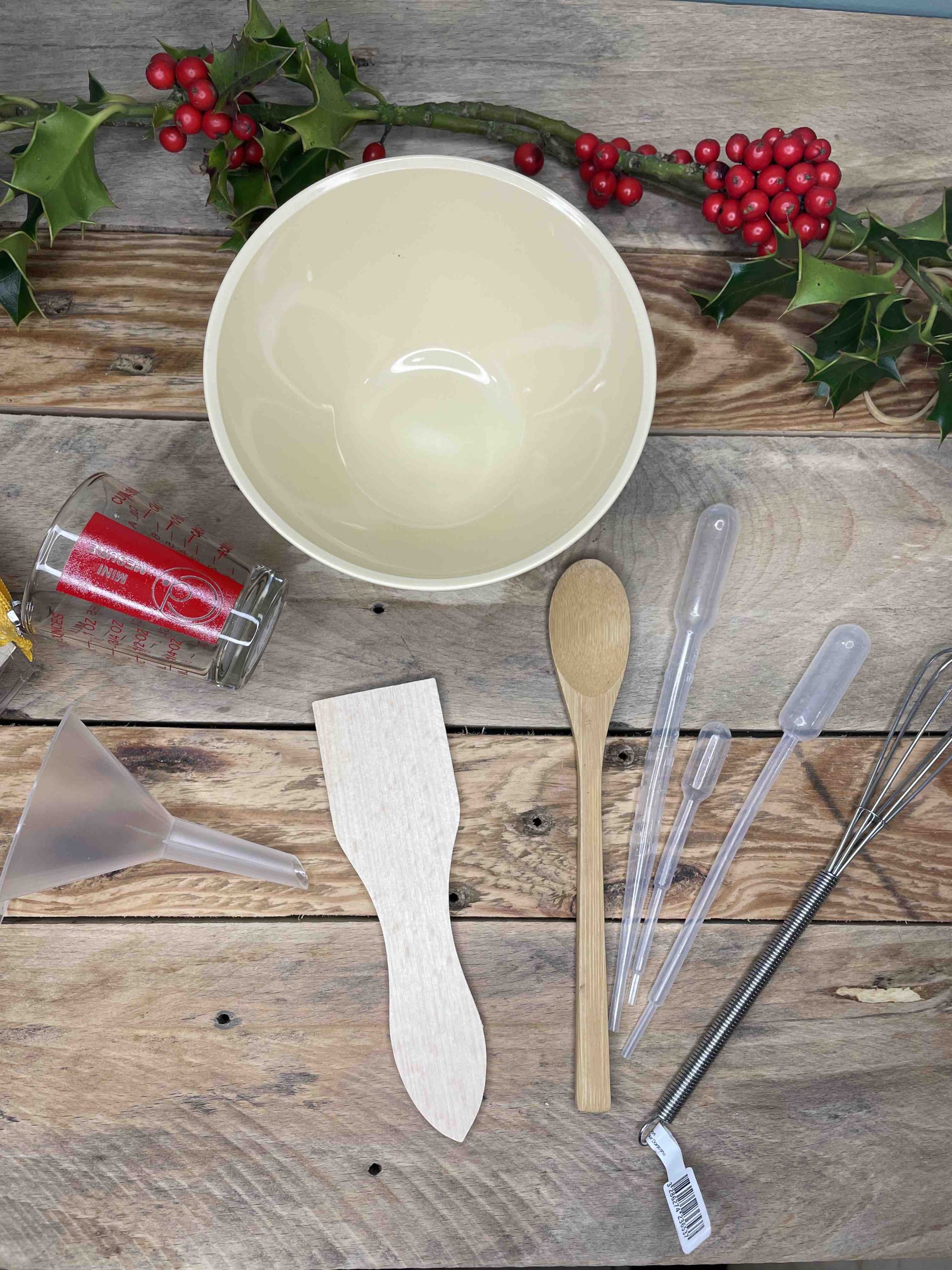 Ce kit contient : un bol, un verre doseur, un entonnoir, une cuillère en bambou, une spatule, un fouet et des pipettes.