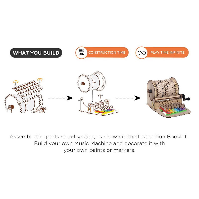 Construisez un xylophone, insérez les chevilles et tournez la poignée pour jouer la musique que vous avez choisie.