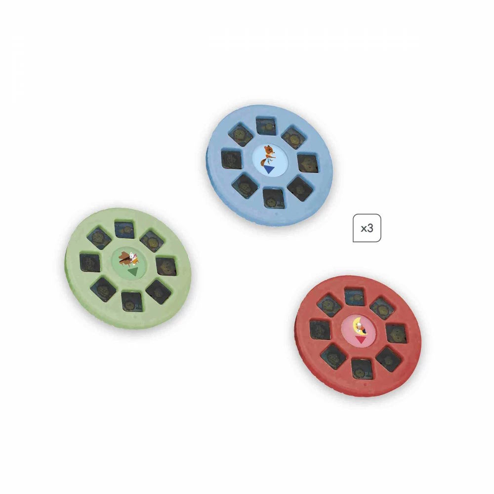 La lampe à histoires est livrée avec 3 rondelles correspondant chacune aux 3 boutons de la lampe et contenant 8 images, ainsi qu’un pochon de rangement.