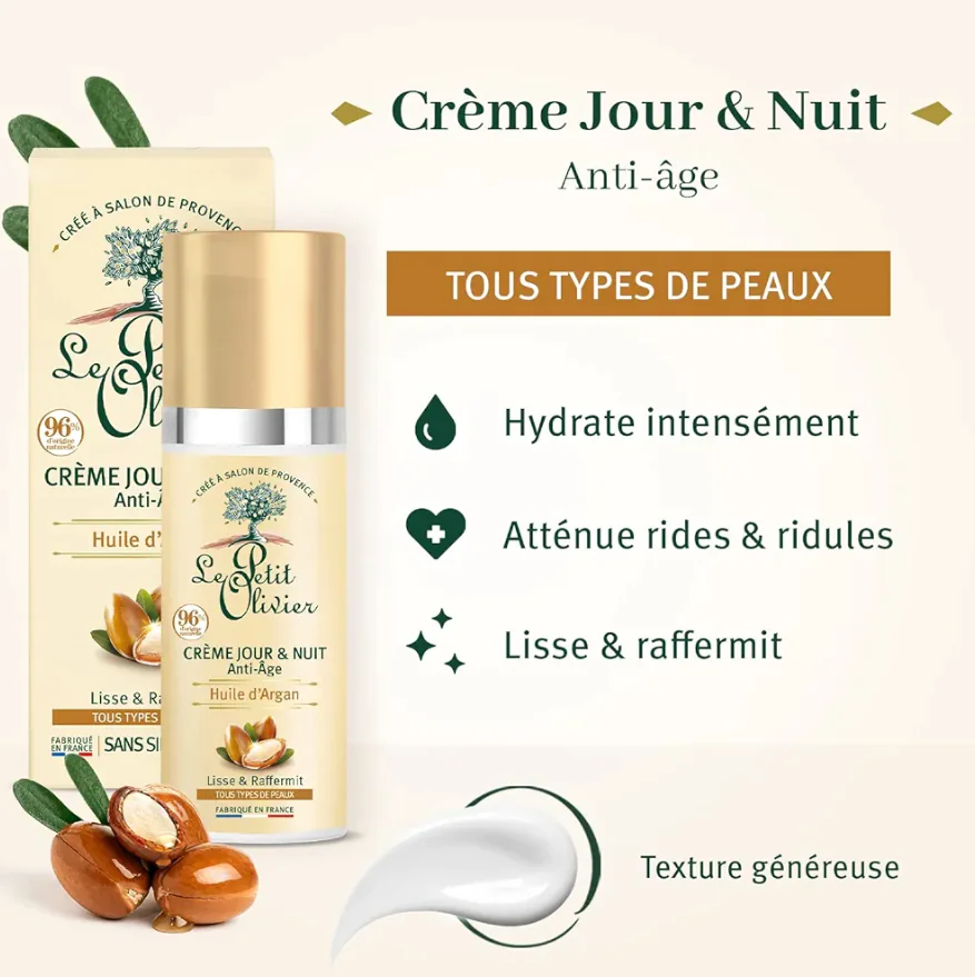 Un Soin Anti-Âge 2 en 1 La Crème Jour & Nuit Anti-Âge Le Petit Olivier, enrichie en Huile d’Argan, aide à révéler la beauté naturelle de votre peau, de jour comme de nuit. Notée 71/100 sur Yook