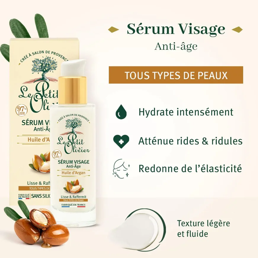 Un Concentré de Soin Le Sérum Visage Anti-Âge Le Petit Olivier, enrichi en Huile d’Argan, vous aide à révéler la beauté naturelle de votre peau.