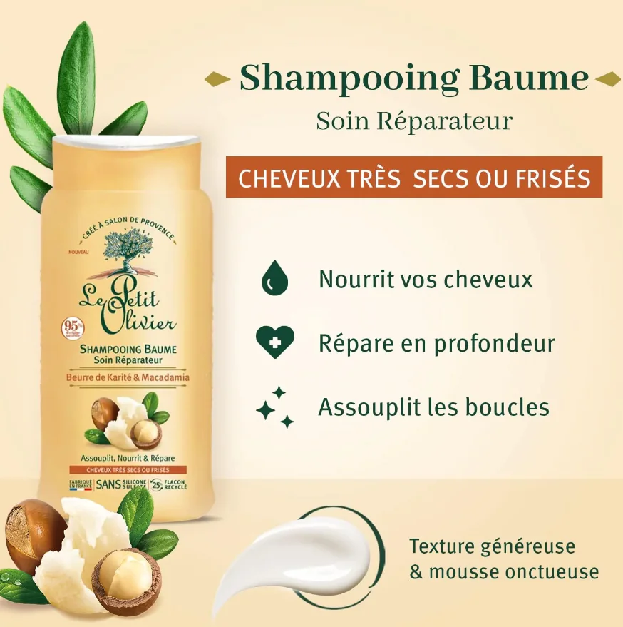 Le Petit Olivier Shampooing Baume Soin Réparateur au Beurre de Karité & Macadamia – Cheveux très Secs ou Frisés -250ml
