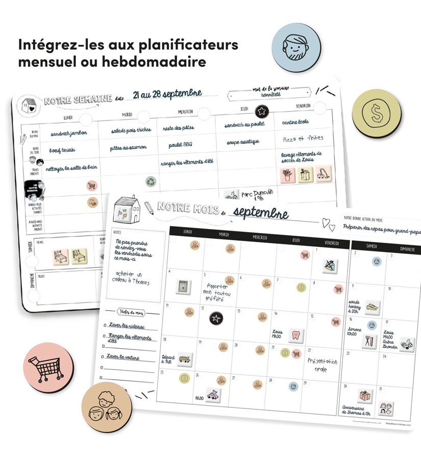 Un kit de 132 mini-pictogrammes aimantés à insérer dans les grands planificateurs (hebdomadaire ou mensuel).