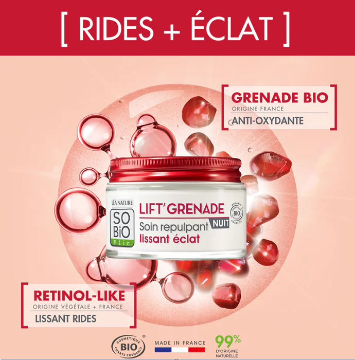 Ce soin de nuit formulé avec de la Grenade bio française, aux propriétés antioxydantes associée au Rétinol-like d’origine végétale, réduit visiblement les rides.