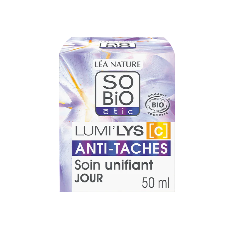 Combattez tous types de taches avec le soin unifiant jour LUMI’LYS [C] de SO’BIO étic. Efficace sur les taches d’âge, de soleil, et d’acné Taches réduites dès 4 semaines 99% d’origine naturelle 0% silicone, huile minérale, colorant de synthèse Made in France