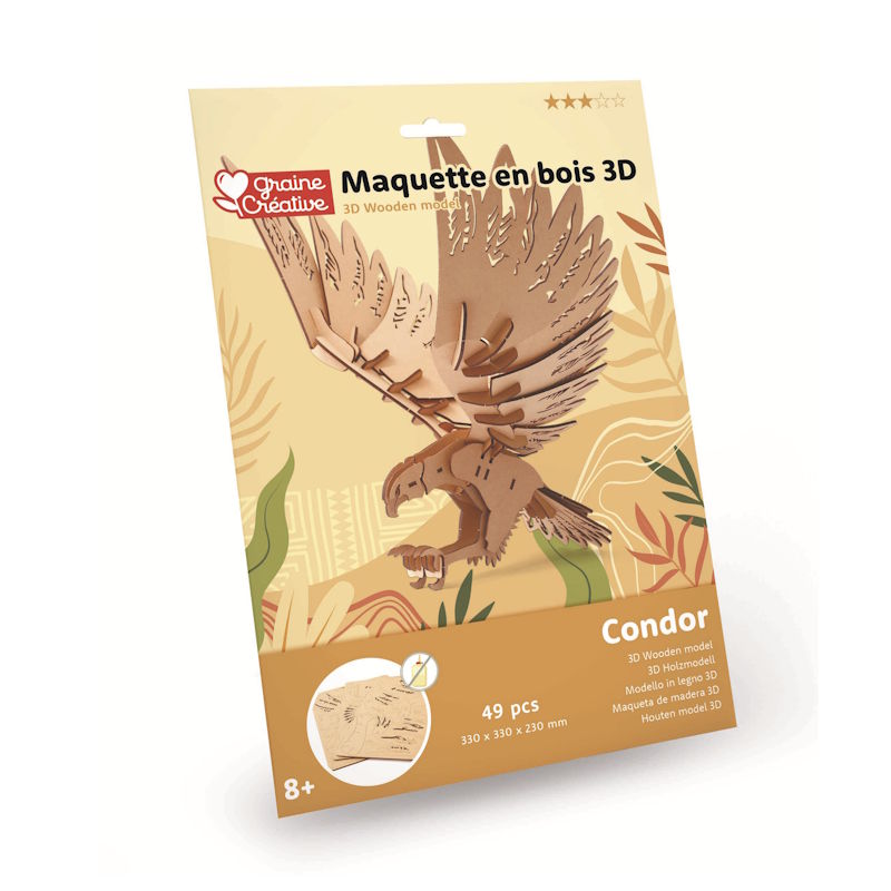 Découvrez la maquette 3D en bois Condor de la marque Graine Créative, une maquette à assembler à partir de 49 pièces. La maquette peut être décorée et ne nécessite pas de colle pour l’assemblage.