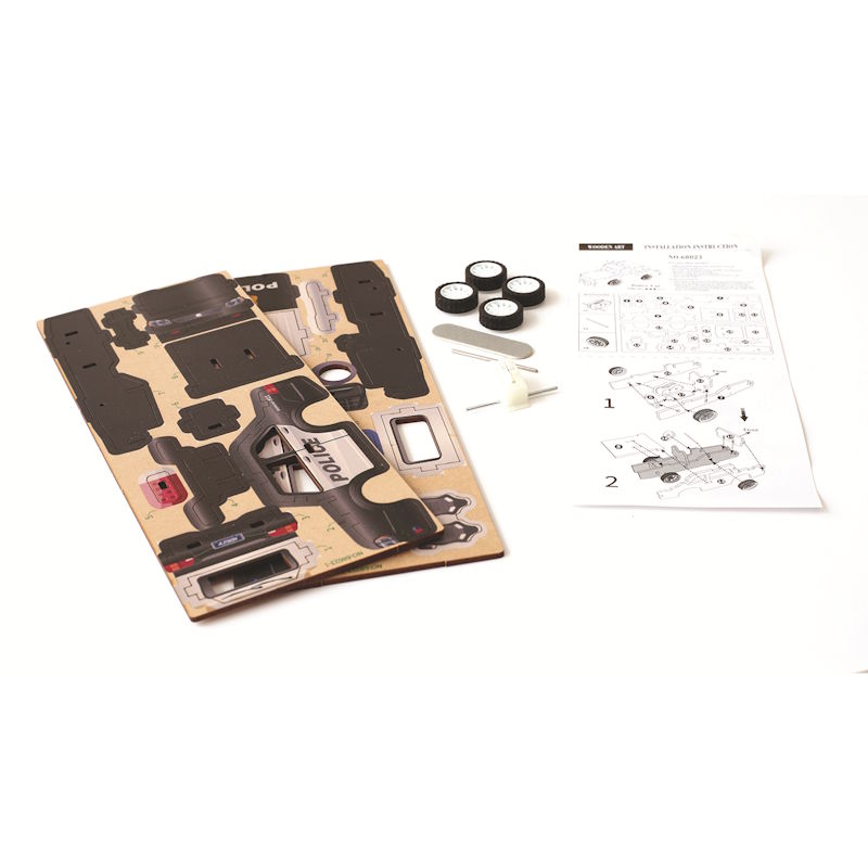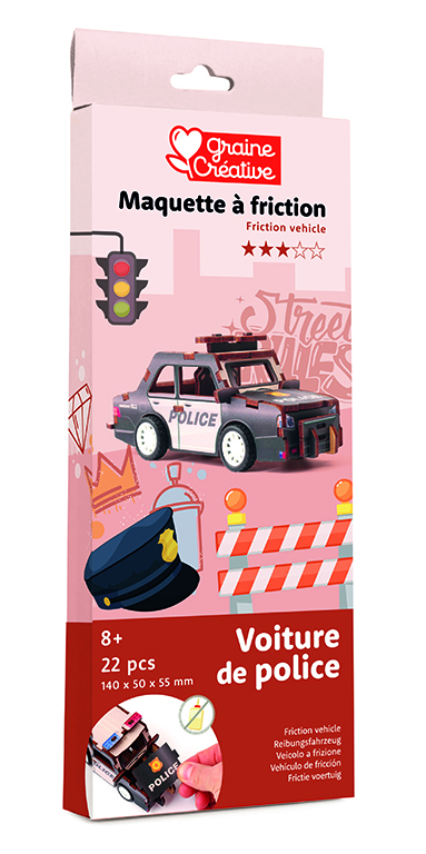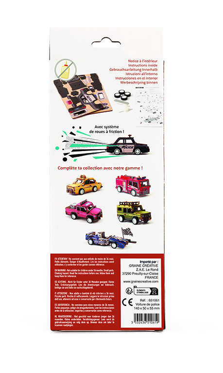 La maquette Voiture de Police de Graine Créative est composée de 22 pièces qui s’emboitent, avec un système de roues à friction.