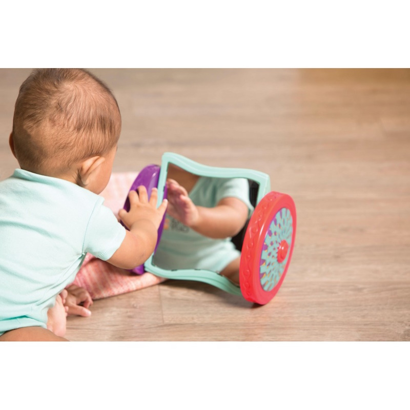 Un miroir coloré qui reste bien droit lorsqu’on le pousse. Ce miroir sur roulettes encourage les bébés à ramper, à bouger et à rester actifs.