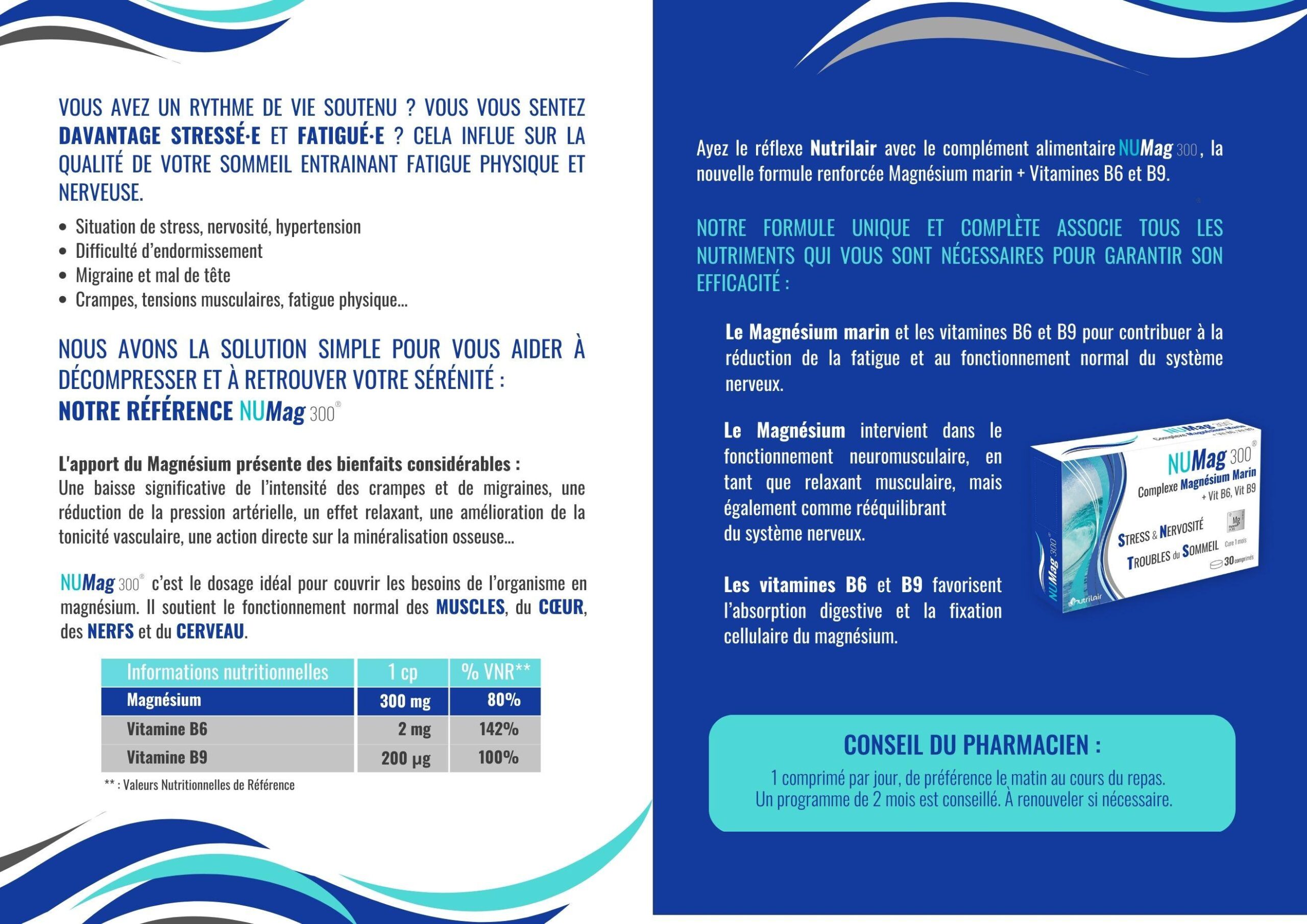 - NUMag 300® c’est le dosage idéal pour couvrir les besoins de l’organisme en magnésium. Il soutient le fonctionnement normal des MUSCLES, du CŒUR, des NERFS et du CERVEAU.
