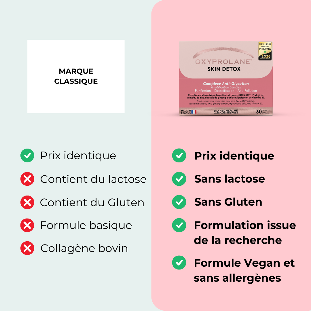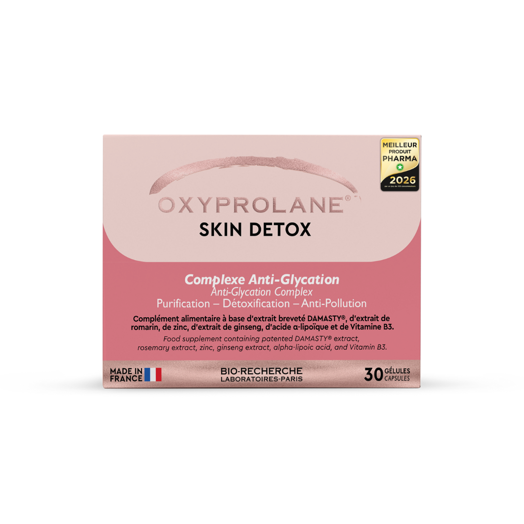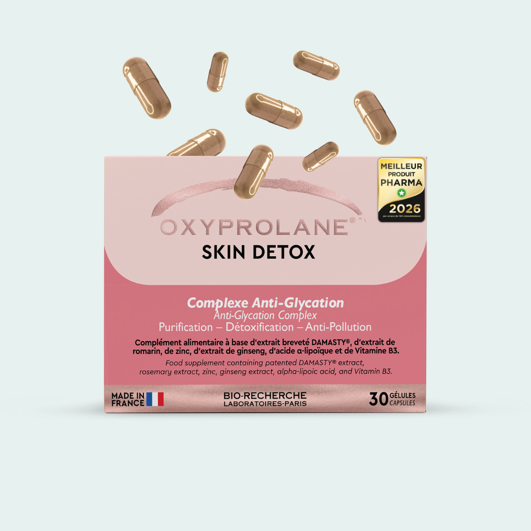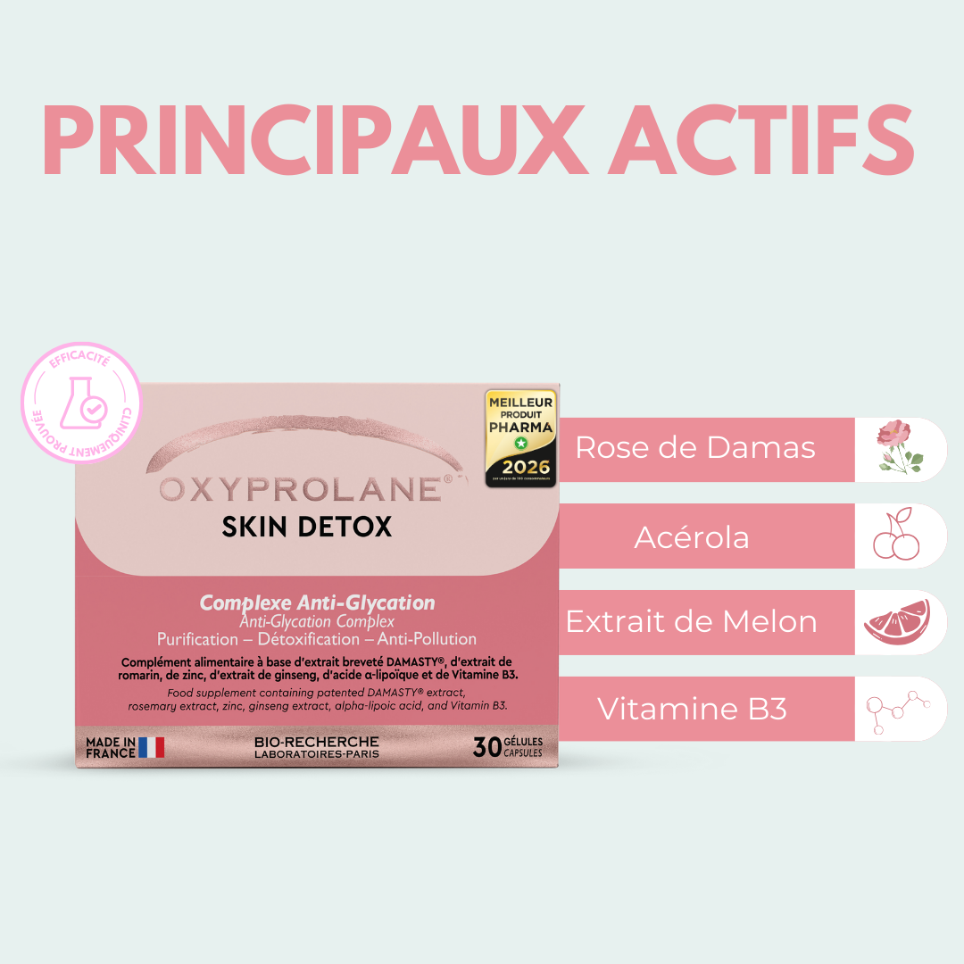 Élu Meilleur Produit Pharma 2026 ! Oxyprolane® Skin Detox , Le complément alimentaire pour protéger votre peau, enrichi en complexe DAMASTY® (extrait de rose de Damas, melon, et acerola). Protège la peau de la pollution et du stress oxydatif : grâce aux antioxydants. Renforce la santé de la peau : grace au ginseng et à la vitamine B3. Prévient la glycation : Grâce à l’acide alpha-lipoïque et au zinc. Prévient les signes de l’âge grace au complexe DAMASTY®. Formule vegan et sans allergènes