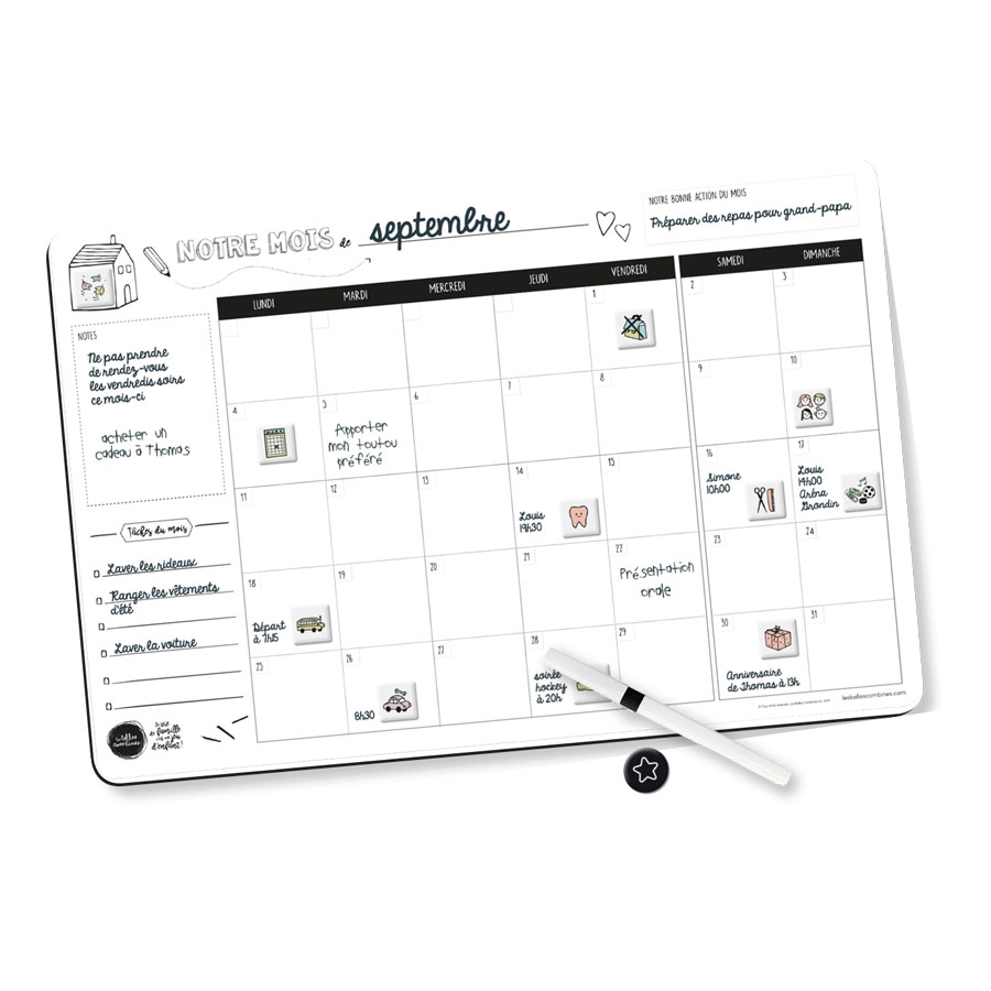 Le planificateur magnétique familial mensuel des Belles Combines vous facilite le quotidien et vous permet de visualiser toutes les activités du mois.