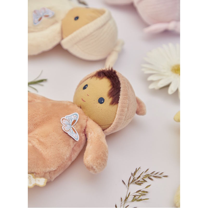 Cet adorable poupon blond de 24 cm se différencie par son corps couleur pêche et ses yeux bleus lumineux. Composé de micro-velours extra-doux, de velours côtelé, et rembourré avec du polyester recyclé, ce poupon en tissu offre une texture moelleuse qui invite à toujours plus de tendres câlins.