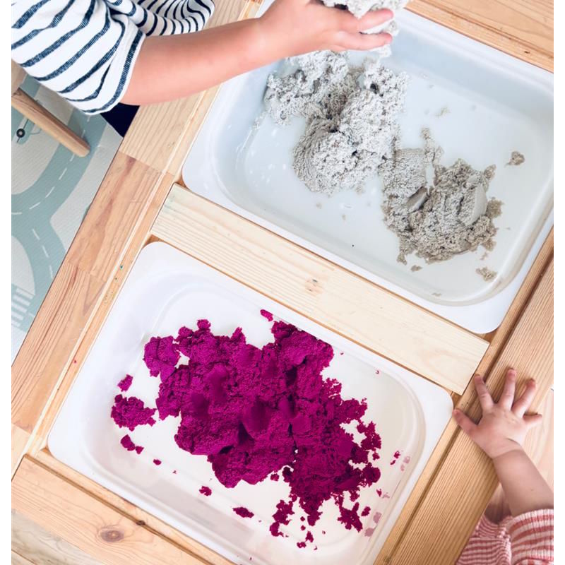 Le sable dynamique est une excellente alternative au sable ordinaire et convient aux activités d’intérieur. Le sable dynamique coule, ne s’effrite pas, est agréable au toucher et peut prendre les formes les plus sophistiquées.