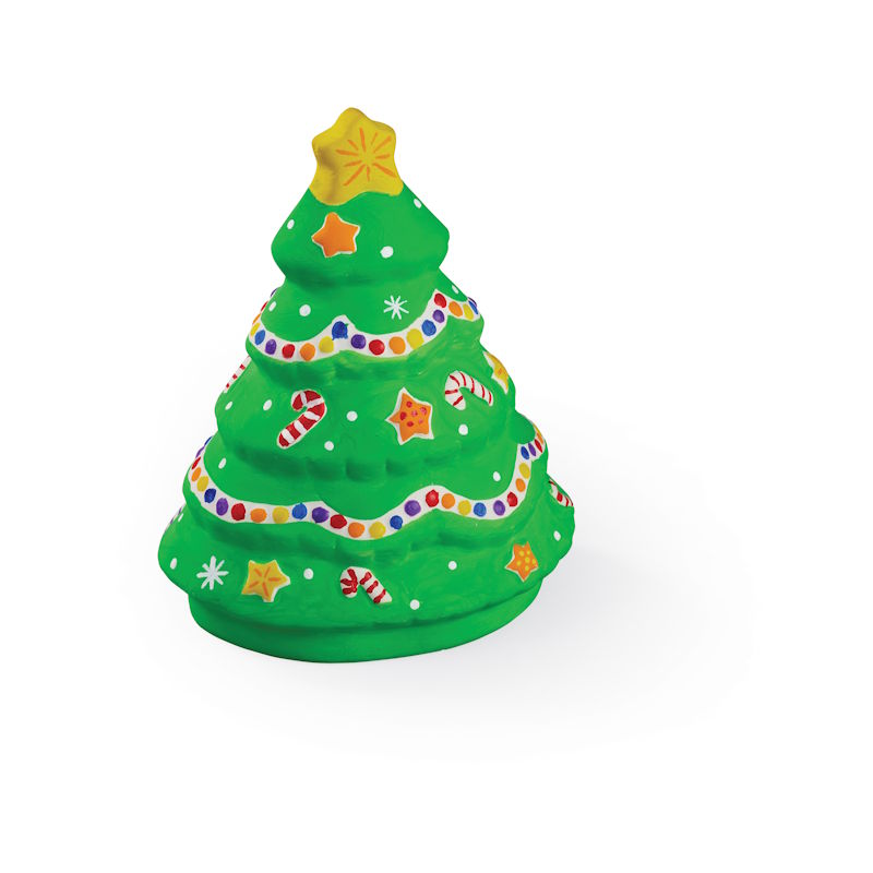 Ce kit festif comprend un sapin en céramique prêt à peindre, huit peintures acryliques aux couleurs vives (dont deux métalliques) ainsi qu’un pinceau.