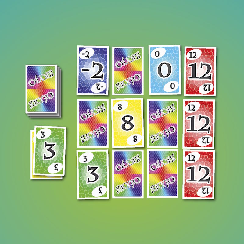 Au début de la partie les joueurs disposent 12 cartes faces cachées devant eux et en retournent 2 faces visibles. A son tour de jeu le joueur doit piocher une carte dans la pioche ou dans la défausse.