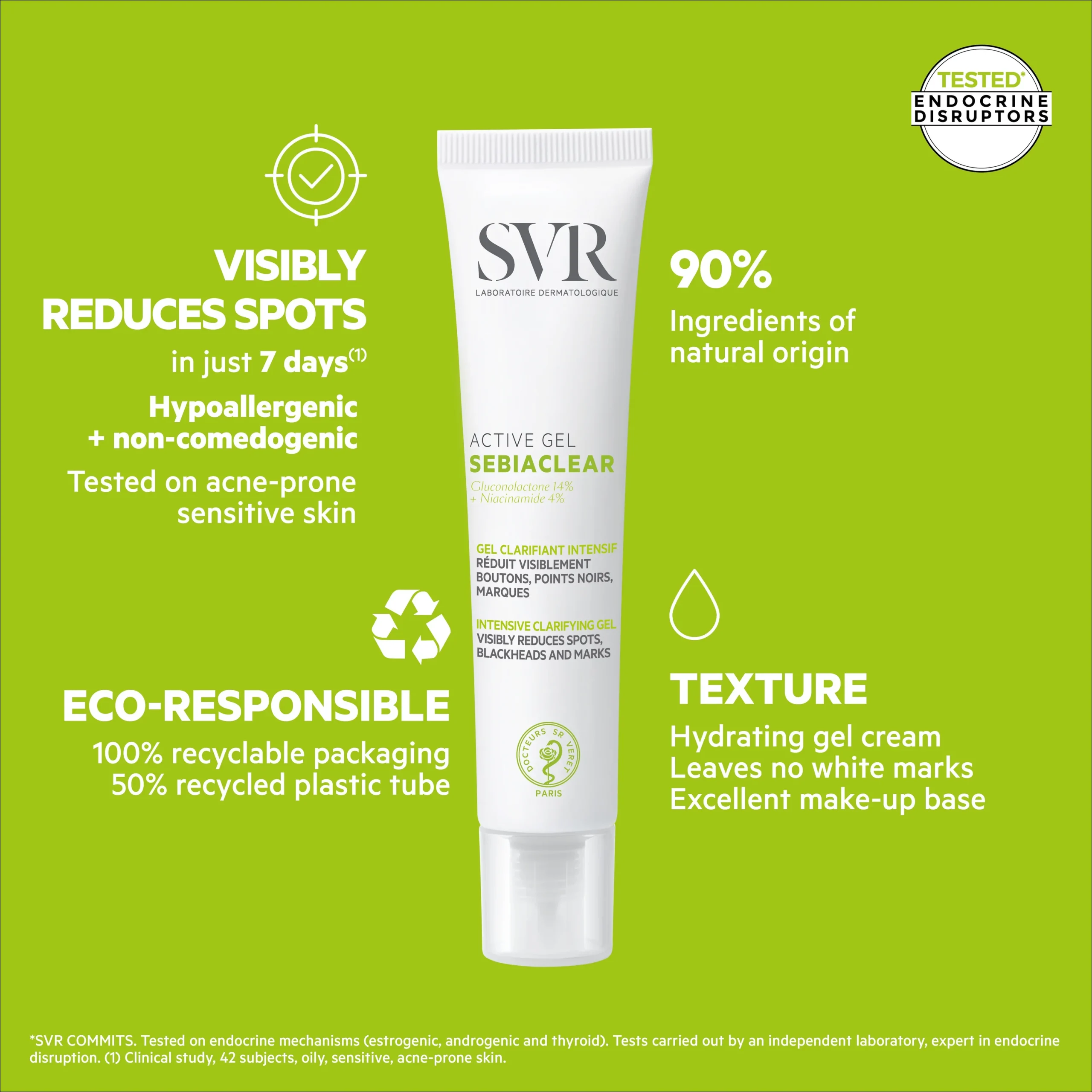 Correcteur intensif contre les boutons, les points noirs, et avec une action anti-marques pour les peaux sensibles à tendance acnéique, imperfections sévères. SEBIACLEAR ACTIVE GEL offre une formule super concentrée en actifs dermatologiques pour des résultats visibles sur les imperfections dès 7 jours. Les boutons et points noirs sont réduits, la qualité de la peau est nettement améliorée, les brillances réduites et les marques rouges ou brunes corrigées. 💚