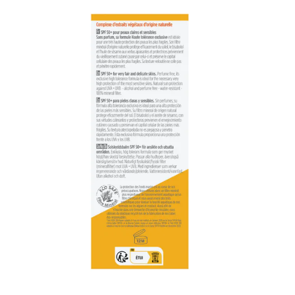 Le Baume solaire bio SPF50+ et sa formule hypoallergénique exclusive offre une haute protection à la peau fragile du visage, aux zones sensibles du corps (cou, décolleté, mains) et aux peaux claires et sensibles.